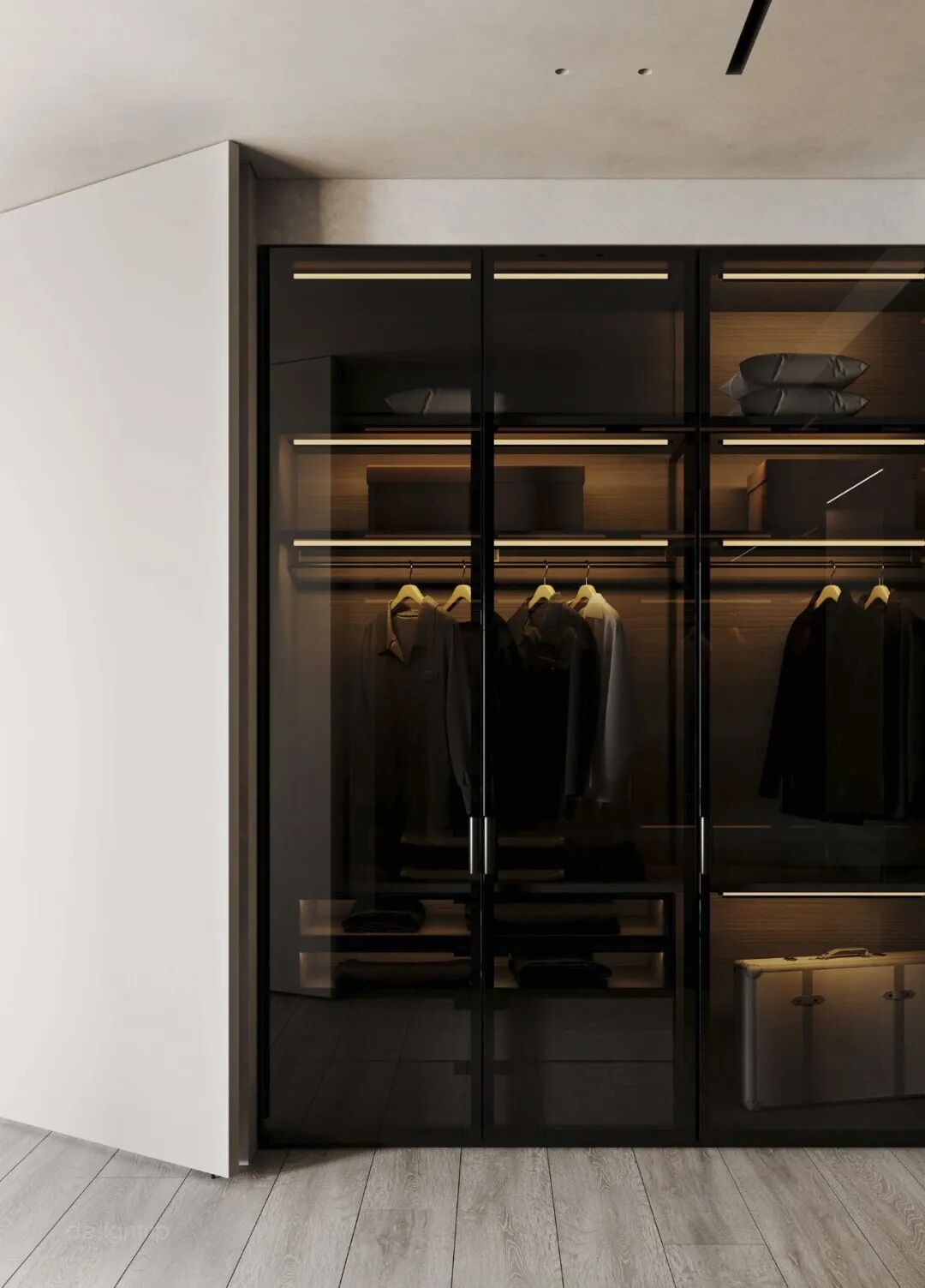 石墨玻璃和暖光打造出低调而精致的衣帽间,它是一个开放式的空间,表现出城市的高品质生活。