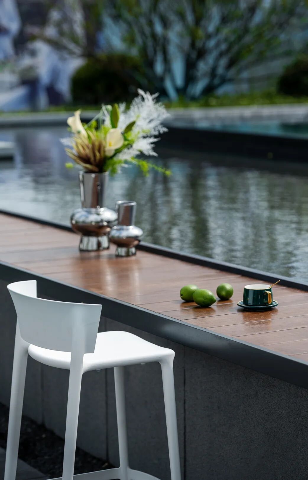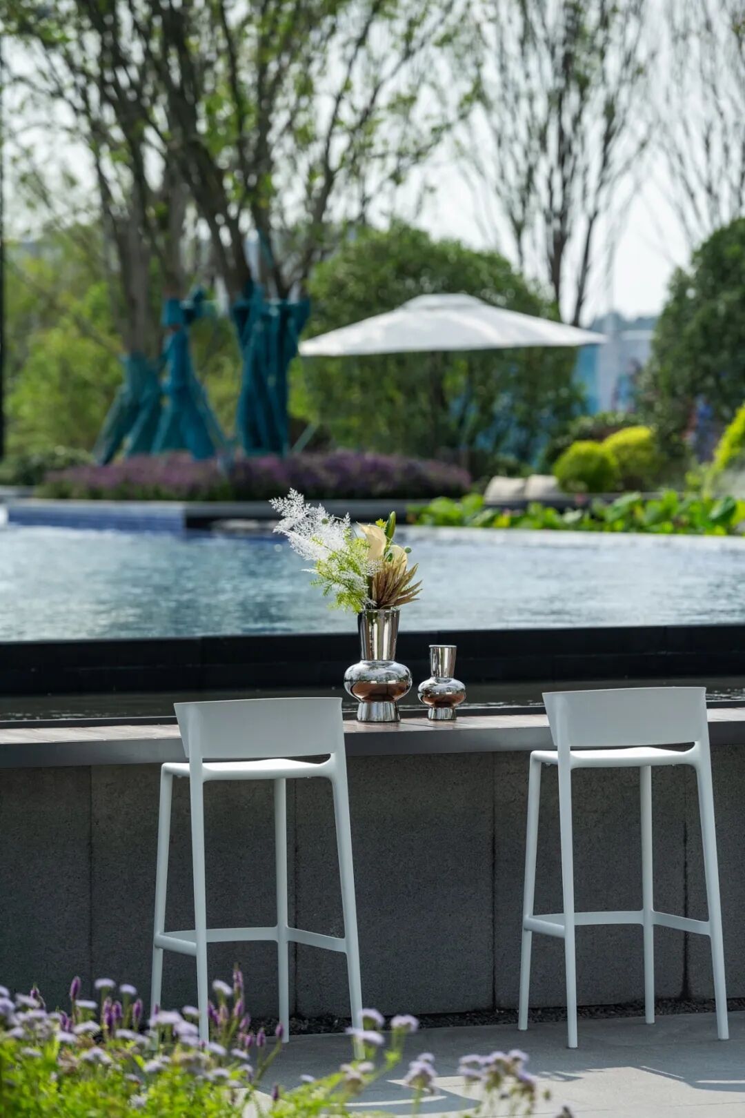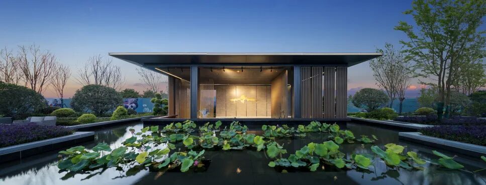 观荷亭一侧的景观会客厅,是一处烟水晴岚、疏影横斜的半开放式空间,精心选配特色林木、艺术雕塑等元素丰富景观细节,营造「风光不与四时同」之美,对生活领域进行有温度的构造,兼具自然美与人文美的艺术表达。