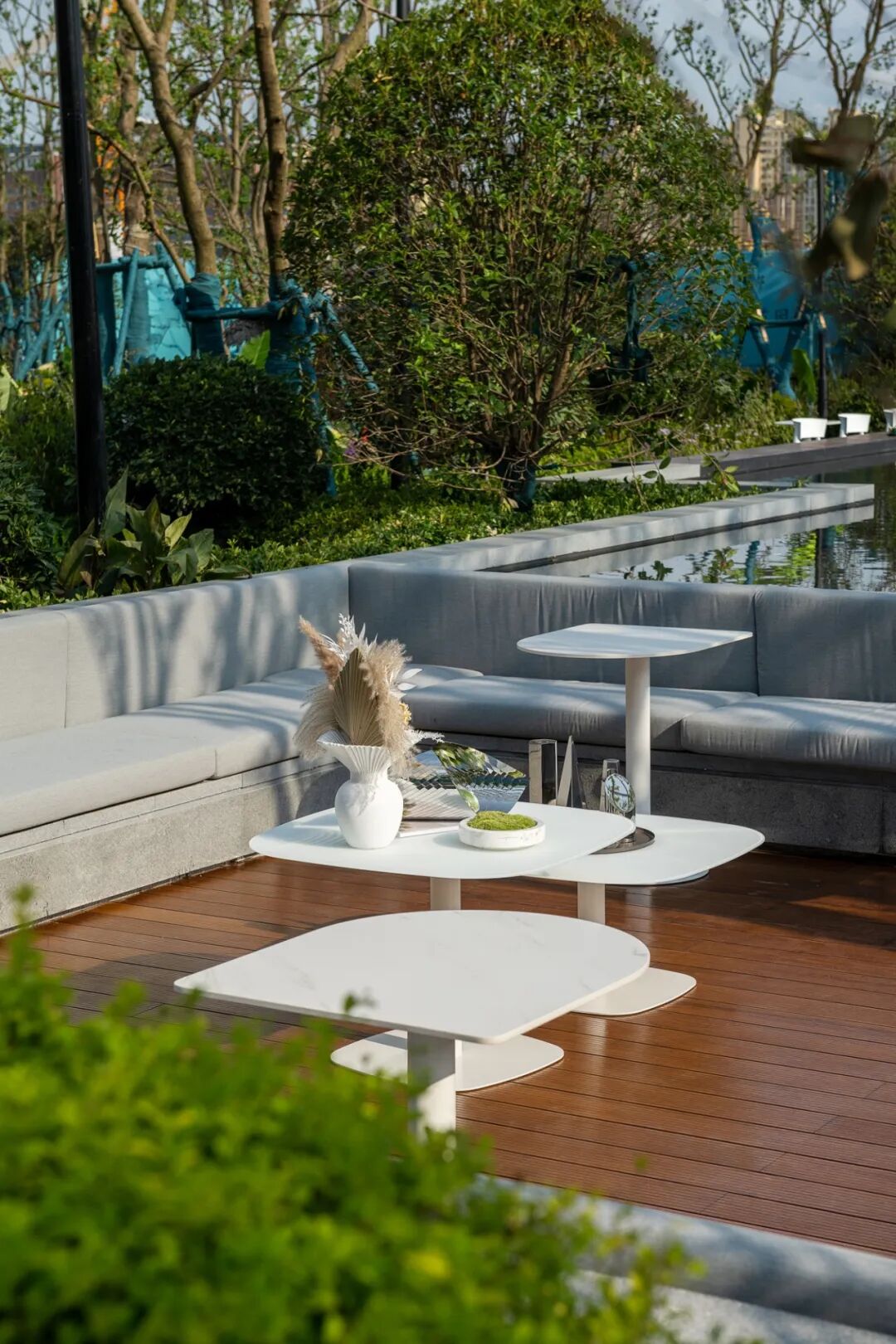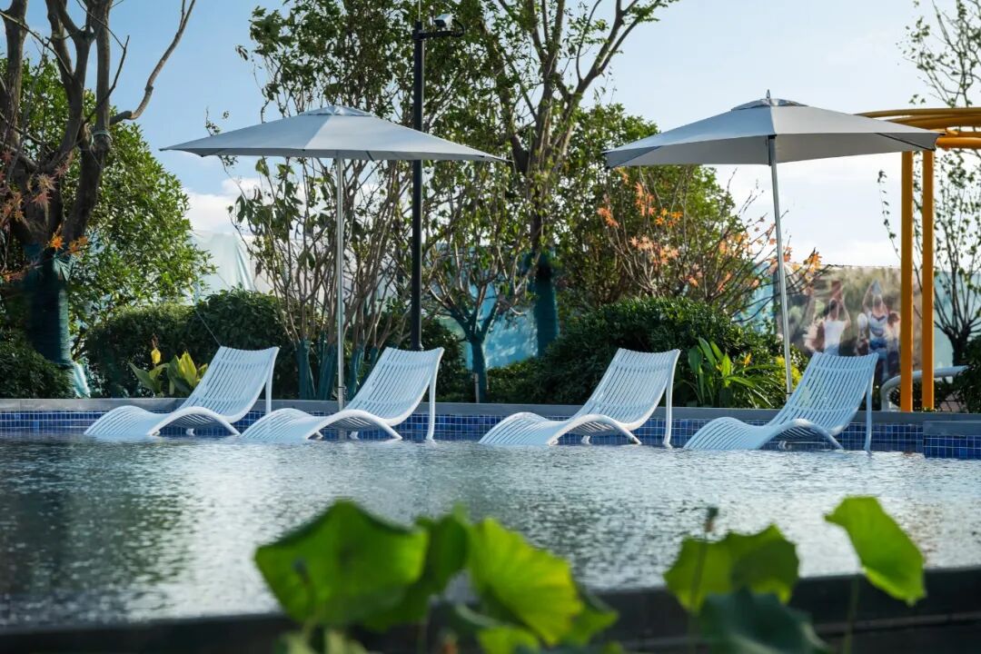 中心泳池基于对场地现状的追溯,以200m景观中轴及中央大尺度楼间距为设计依托,通过现代简洁的设计语言,溢水式的边缘设计,运用蓝白相间的马赛克泳池砖,呈现闲适惬意的度假型无边泳池空间。
