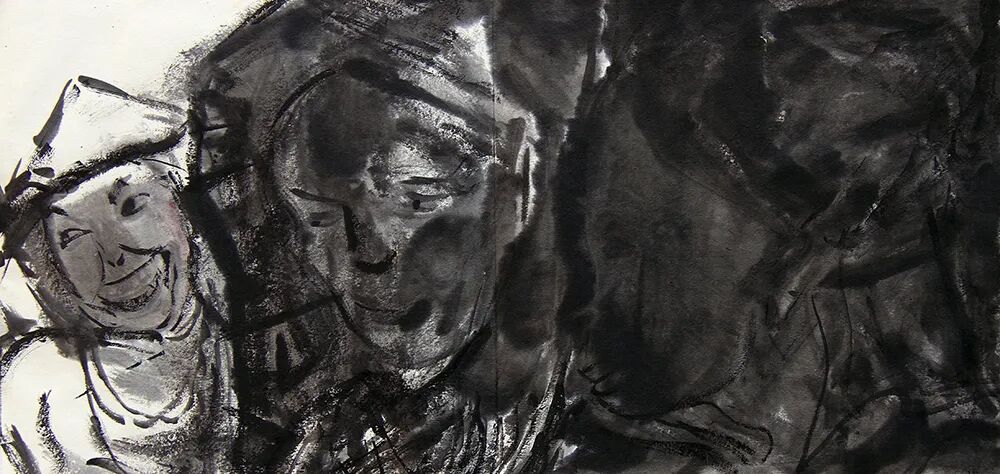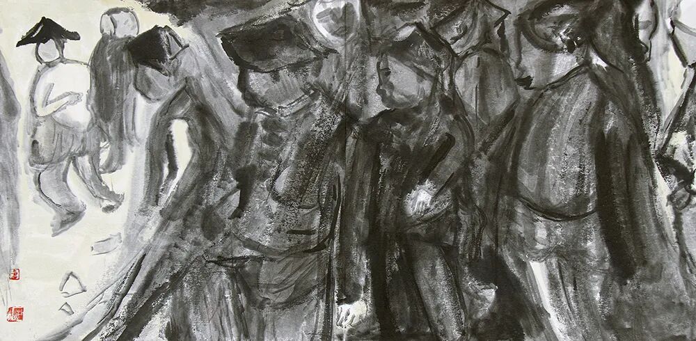 “黑衣壮族”系列作品,是画家健勇“蓄谋已久”的一份重量,从他的言行里体会到了那份无法忘怀的深度情愫……已经不可更改。为此他用前奏引入状态的方式,画了大量的工人、农民、士兵和消防队员等不同职业的人物,手法多样,方法也复杂,虽不能说是为了这个原因,但至少在这个时期让他不能释怀的还是远方那个神秘的黑衣壮族,虽未动笔,但健勇的水墨从这时开始似乎就被附予了某种力量和意义。