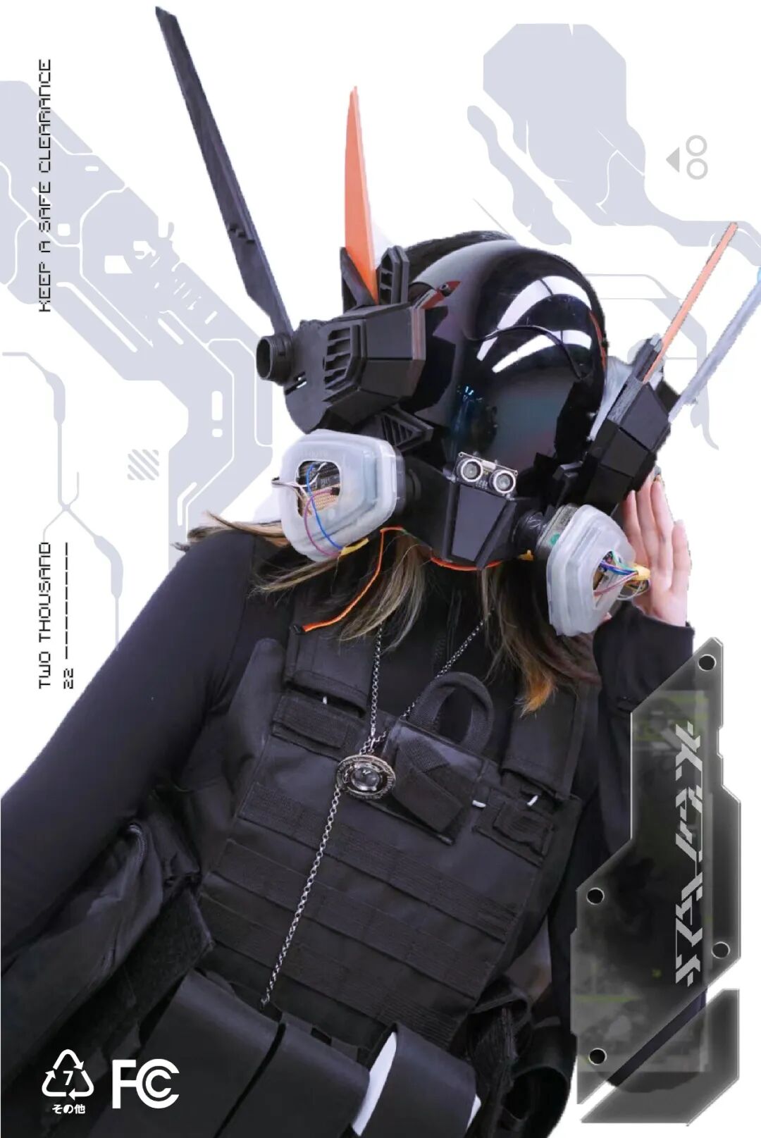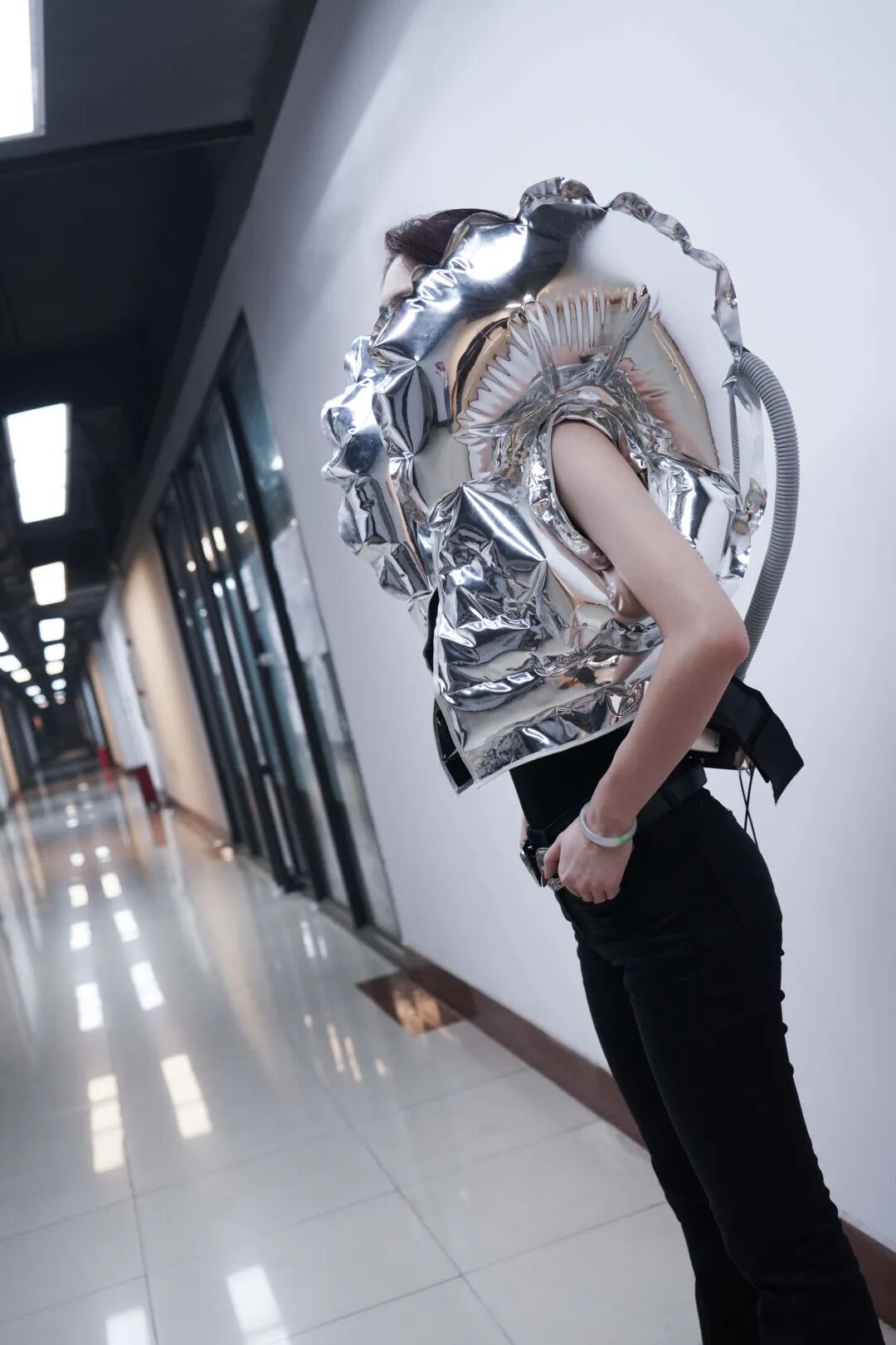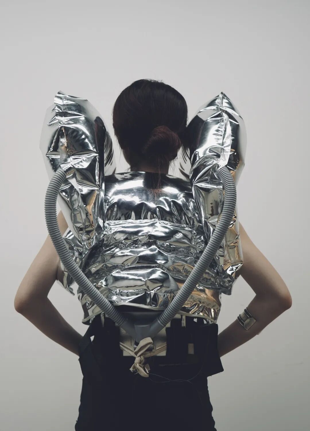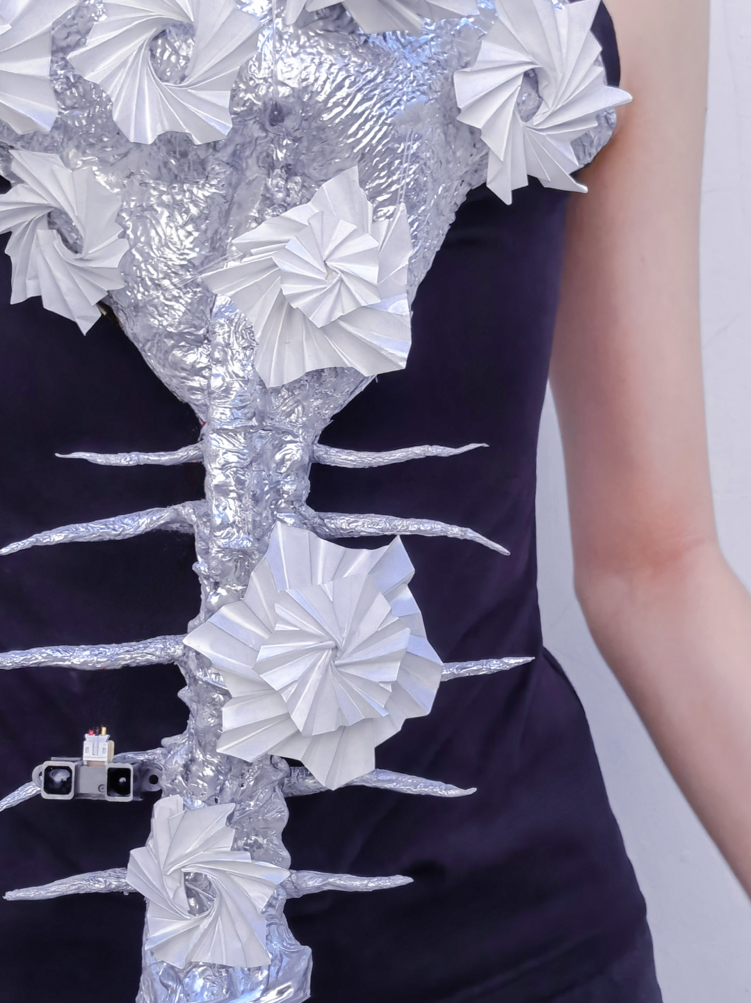 距离,交流,介质都是影响我们社交安全感的关键因素。无论是过近或是过远都不利于我们社交状态。所以我们需要找寻一个合适的社交距离。作品通过红外传感器进行距离数据的测量,当他人与我们的距离到达设定值,即会触发内置的气泵,促使服装充气变形形成包裹态对穿着者进行保护,维持安全的心理与物理距离。