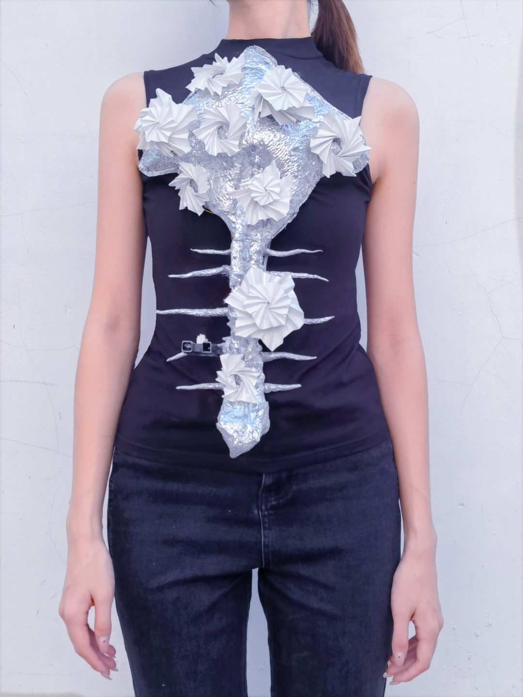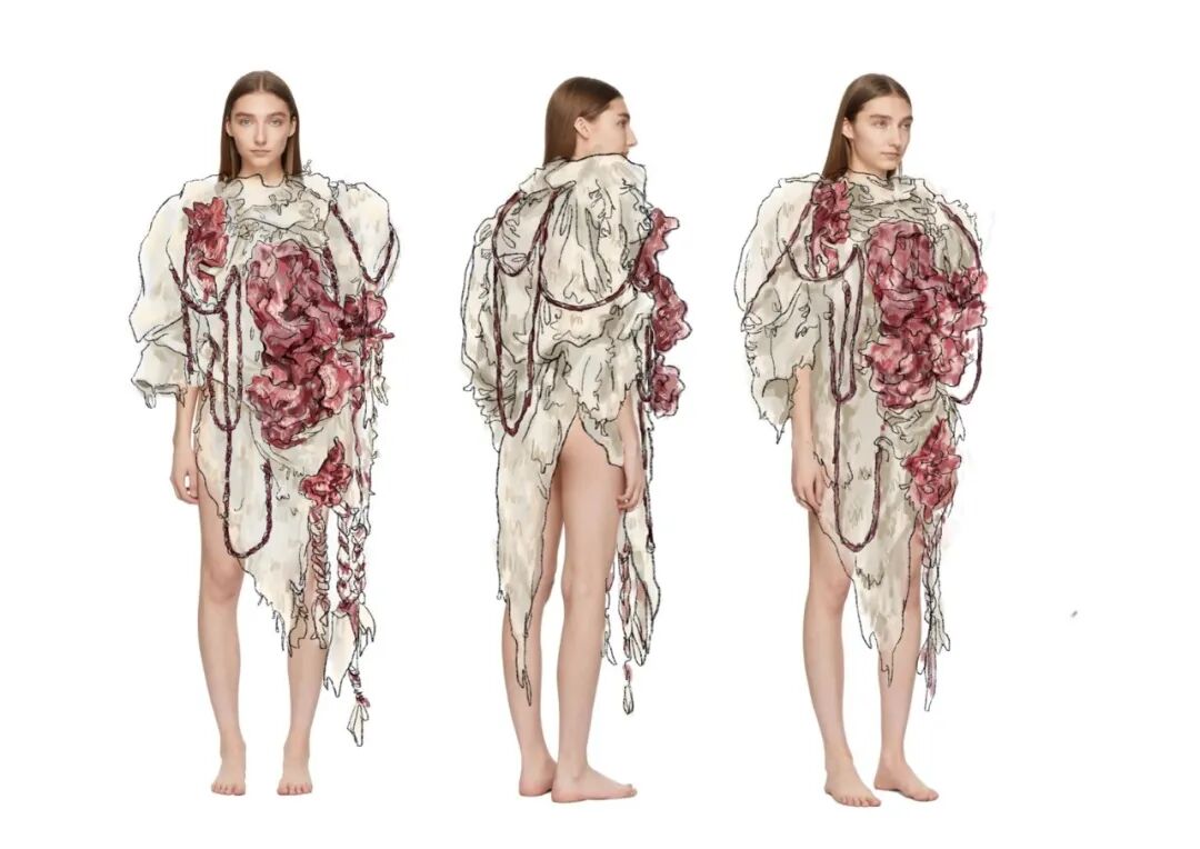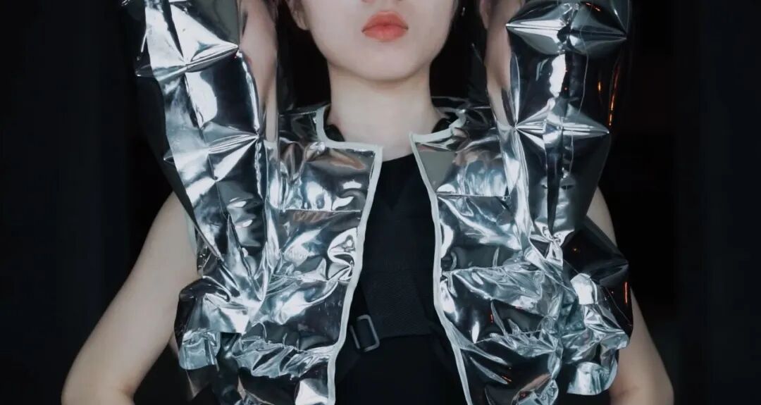 作品灵感来源于伍尔夫的“生命三部曲”,意在演绎废墟中蓬勃而凄凉的新生命。遵循着鲜明的废墟化创作,表现破碎化、忧郁化、多义化特征。伍尔夫的“生命三部曲”中的废墟世界充满着拾荒者和城市边缘人的心灵创伤,演绎着死亡与重生的对立统一,预示着在废墟之中寻找救赎的希望。作品利用脉搏传感器,当其感应到穿着者的脉搏跳动时,服装会随着脉搏一同“跳动”,与穿着者成为“命运共同体”,呈现整个世界中有机生命体与无机物共同对于生和希望的歌唱。