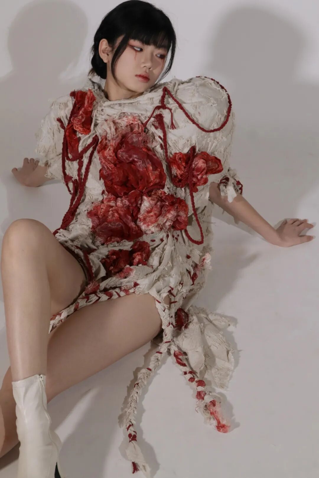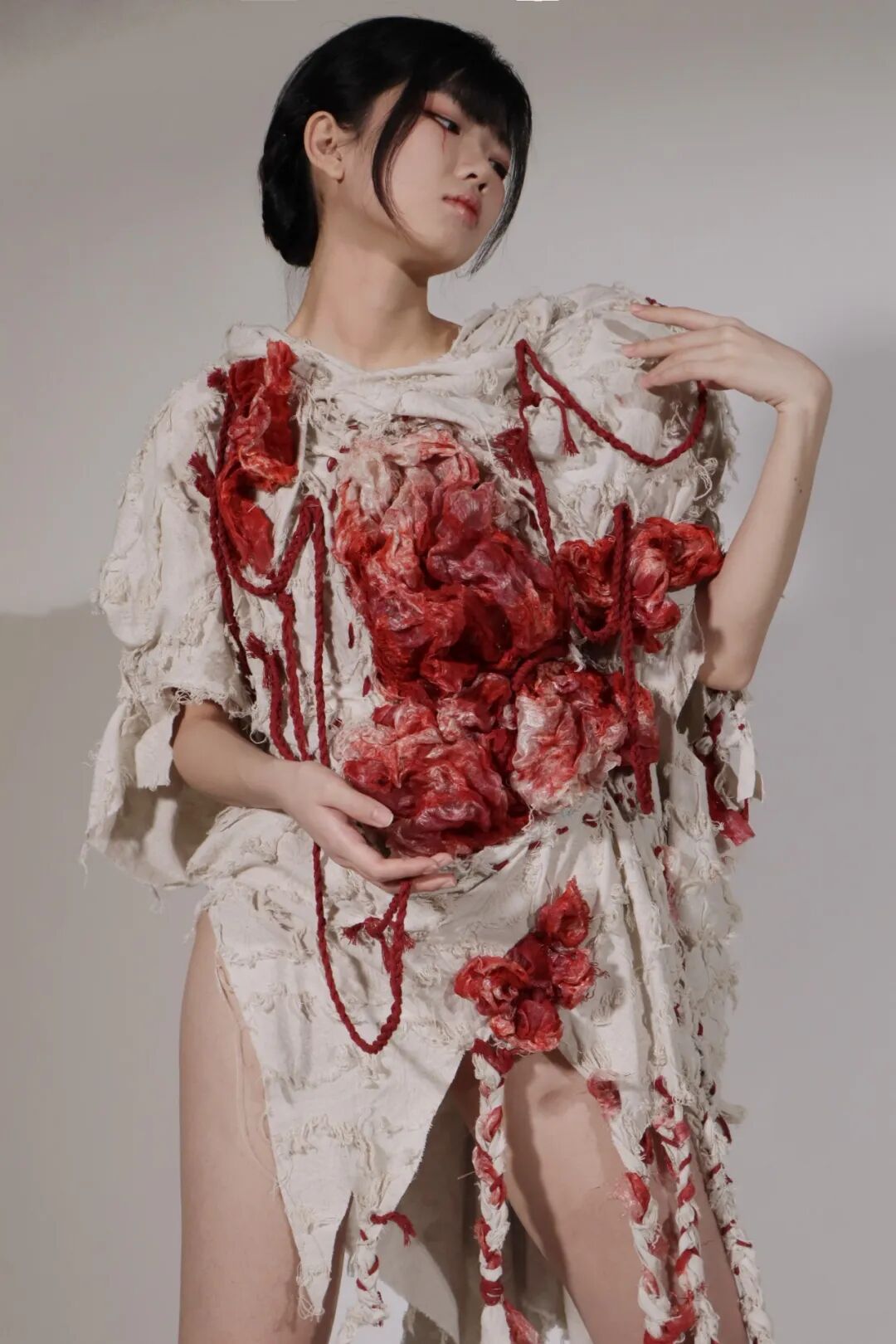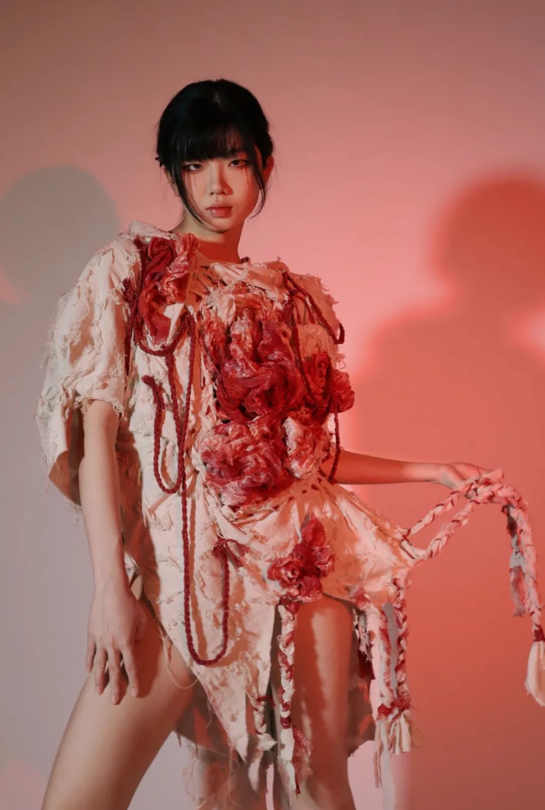 作品灵感来源于伍尔夫的“生命三部曲”,意在演绎废墟中蓬勃而凄凉的新生命。遵循着鲜明的废墟化创作,表现破碎化、忧郁化、多义化特征。伍尔夫的“生命三部曲”中的废墟世界充满着拾荒者和城市边缘人的心灵创伤,演绎着死亡与重生的对立统一,预示着在废墟之中寻找救赎的希望。作品利用脉搏传感器,当其感应到穿着者的脉搏跳动时,服装会随着脉搏一同“跳动”,与穿着者成为“命运共同体”,呈现整个世界中有机生命体与无机物共同对于生和希望的歌唱。