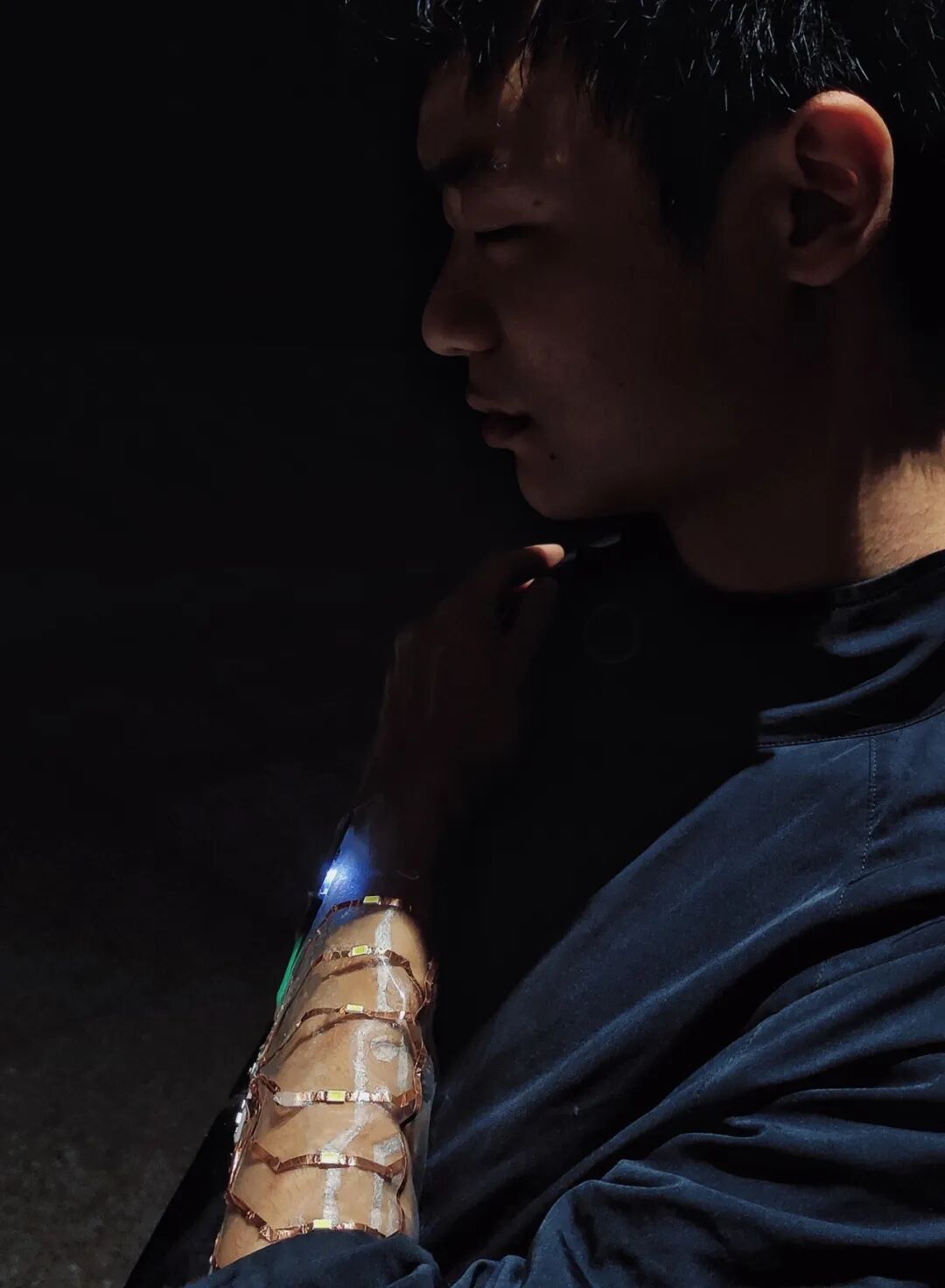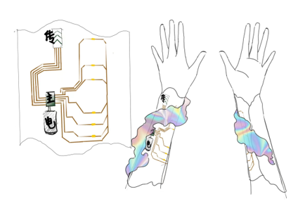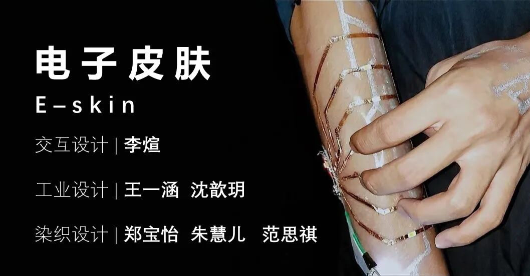 在未来,传感器和电子元件将会成为身体的一部分。本作品利用柔性EVA材料和铜箔组成一个具有计时功能的可穿戴电子皮肤。触摸激活后,产品上的六个小灯会依照触摸时长设定计时长度,随着计时时间流逝小灯逐个熄灭,到设定时间后全部熄灭,直观方便地让人使用与观察。