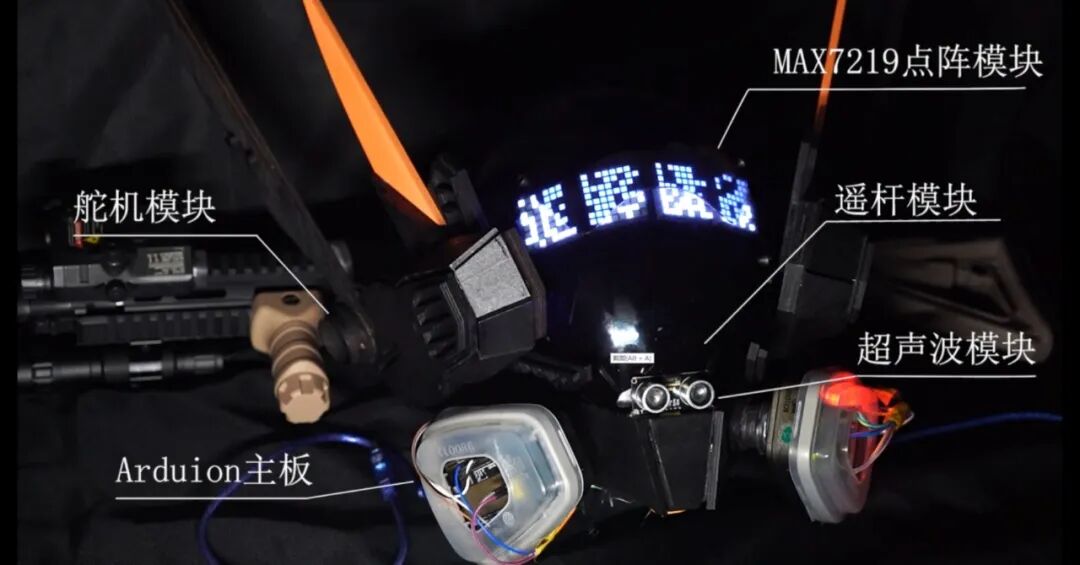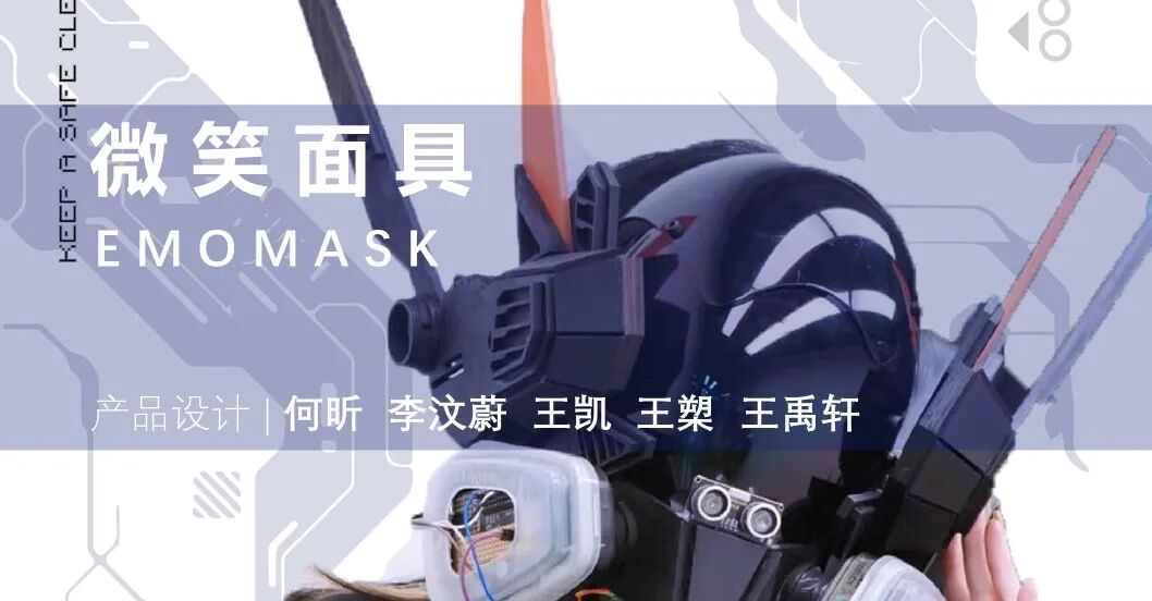 在3045年,环境受到了严重的破坏,大气受到了极大的污染,人们不得不戴上防毒头盔来保护自己。坚实的头盔保护了人们的安全与健康。但头盔下的人们无法再通过表情来抒发自身的情感,人们的交流逐渐减少,人与人之间的距离也越来越远。为了人们能够更好的交流和表达情感,一款名为“微笑面具”的情感识别头盔诞生。我们设定了四种表情,人们可以运用面部肌肉操控内置摇杆切换表情。超声波传感器可以识别外来危险物靠近并发出信号控制耳朵的摆动,以便在交流沟通的过程中提醒人们保持一定的社交距离。