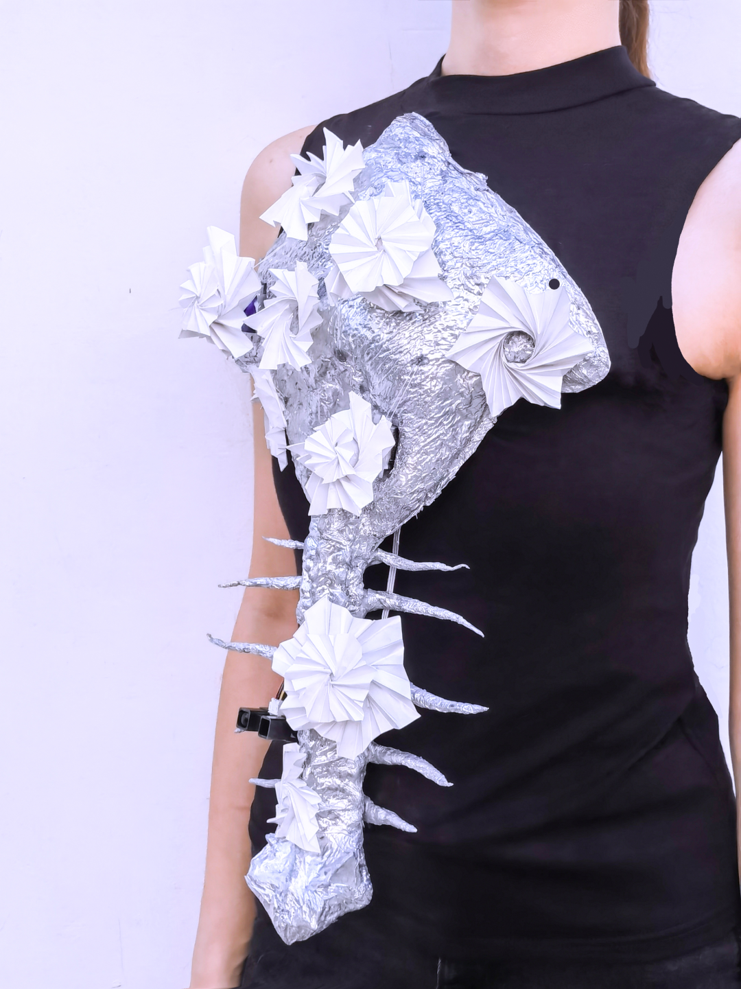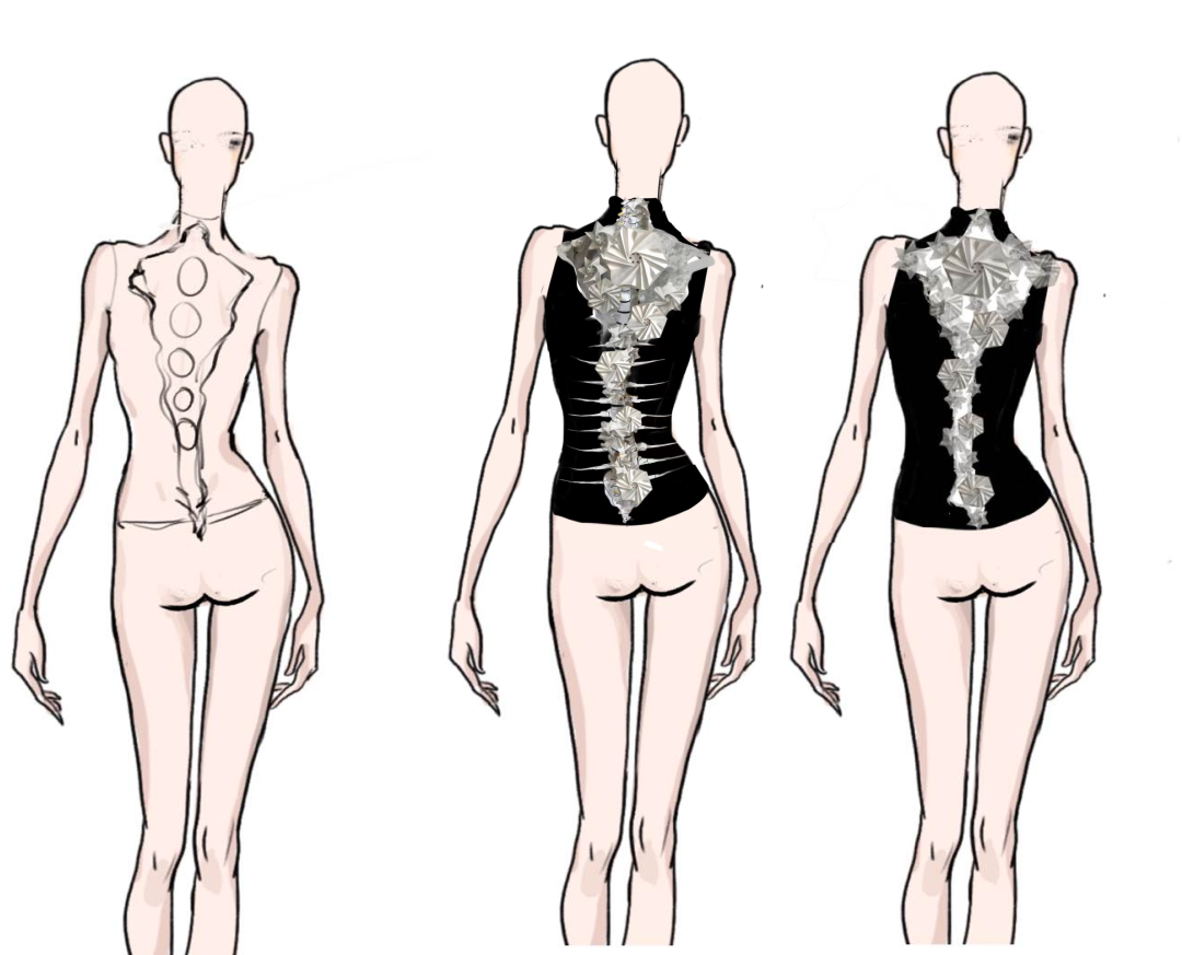 脆弱,易碎和不安全感一直伴随着女性成长的一生,以骨头为载体,用较为锋利的材料做出花朵的外形,寓意花朵虽美,但是观赏要有距离,呼吁女性保护应当引起人们的重视;我们选择旋转的元素,利用折纸的工艺与电子元件的结合实现旋转装置的红外感应自转,从而实现花朵由中心绽开的效果。
