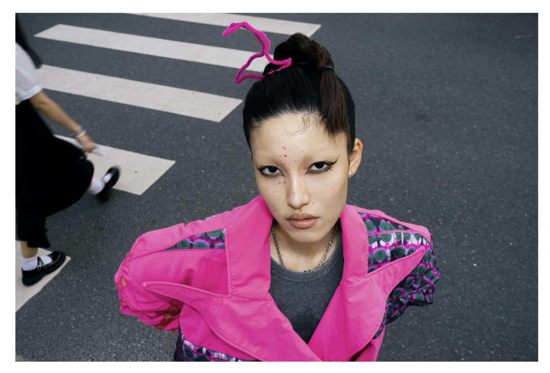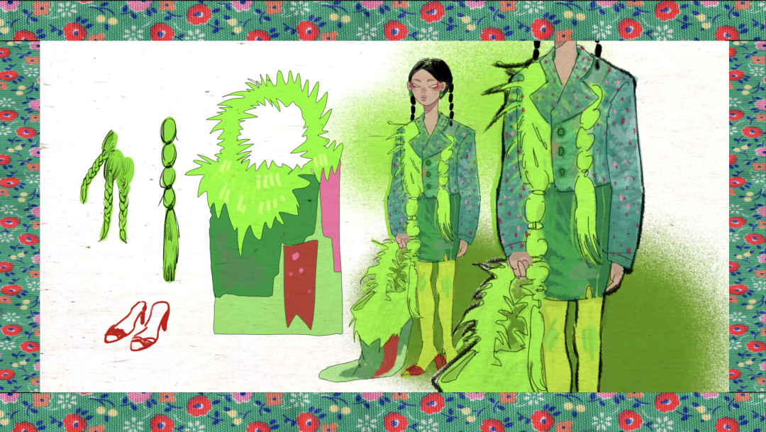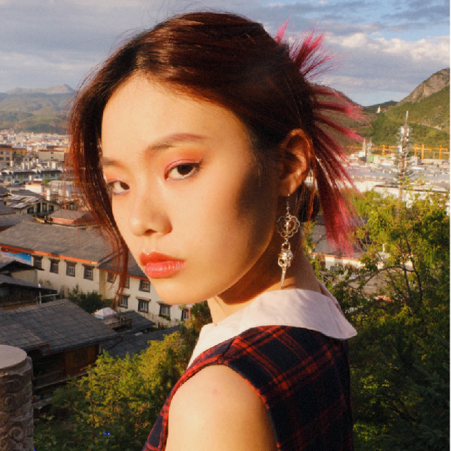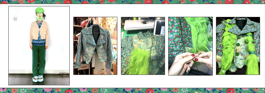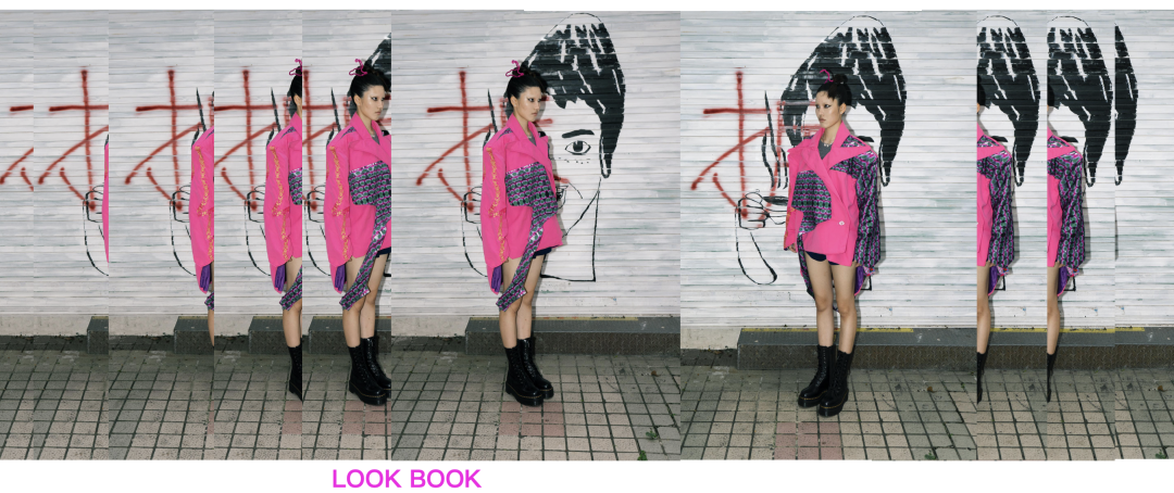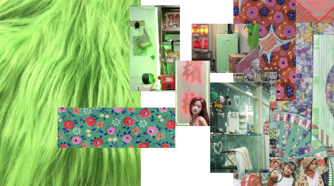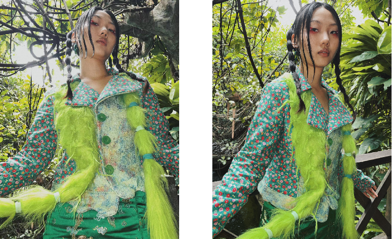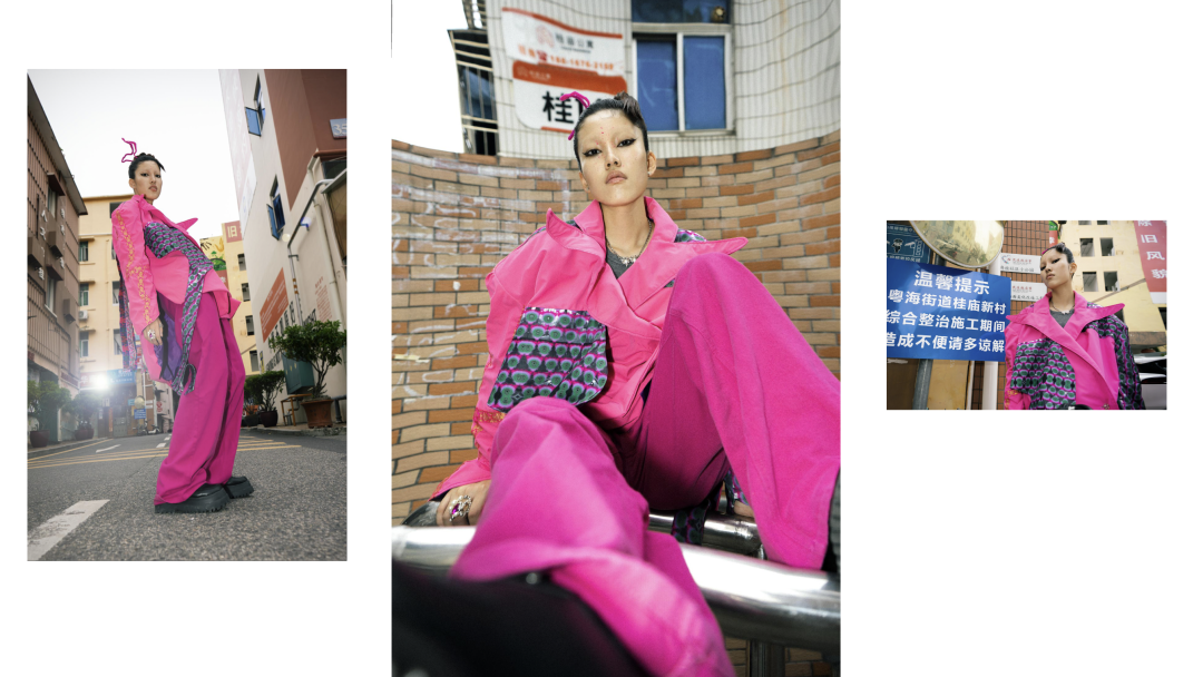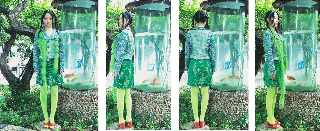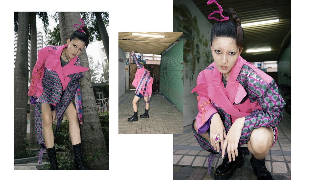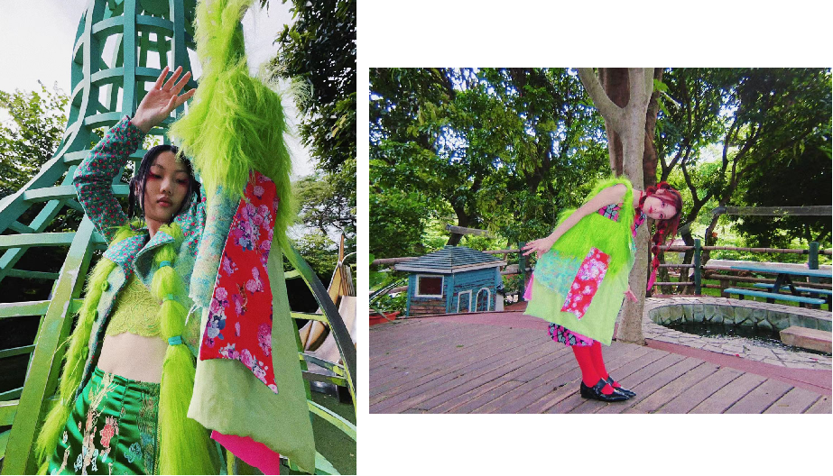 作品主题围绕着童年时代亦是千禧年代的氛围展开设计,想要通过衣服表现出廉价且多彩的趣味性。灵感来源于“发廊小妹”艳俗却灵动的独特美感,通过衣服和视频对阿青这个形象进行猜想,让主题更生动。