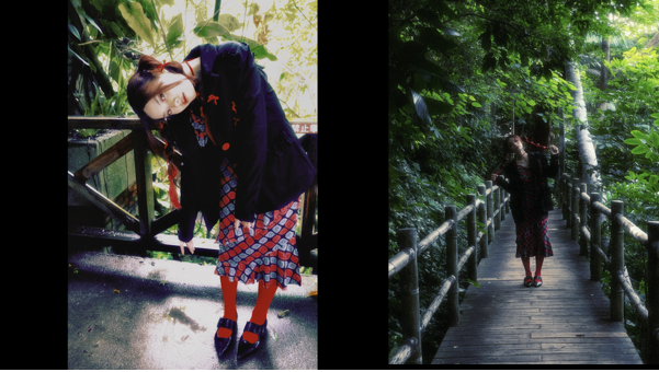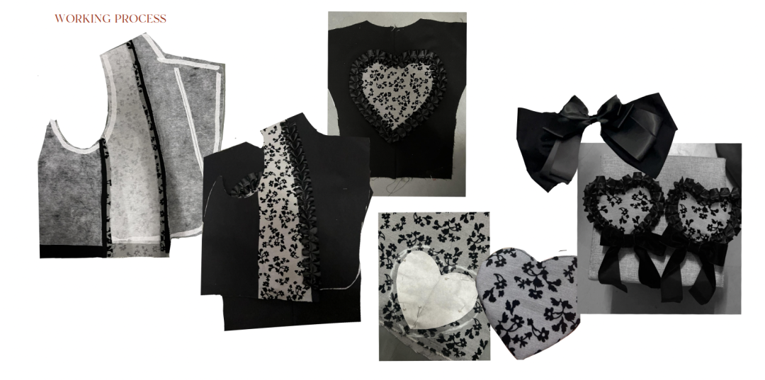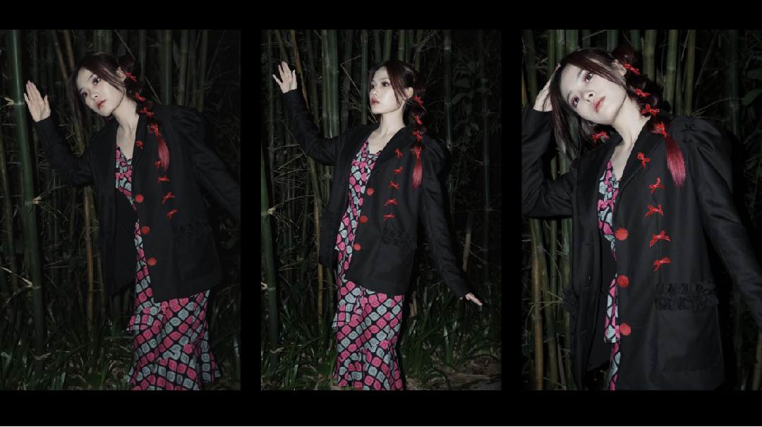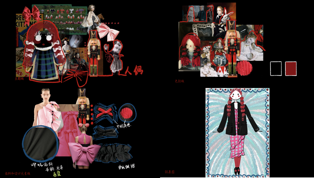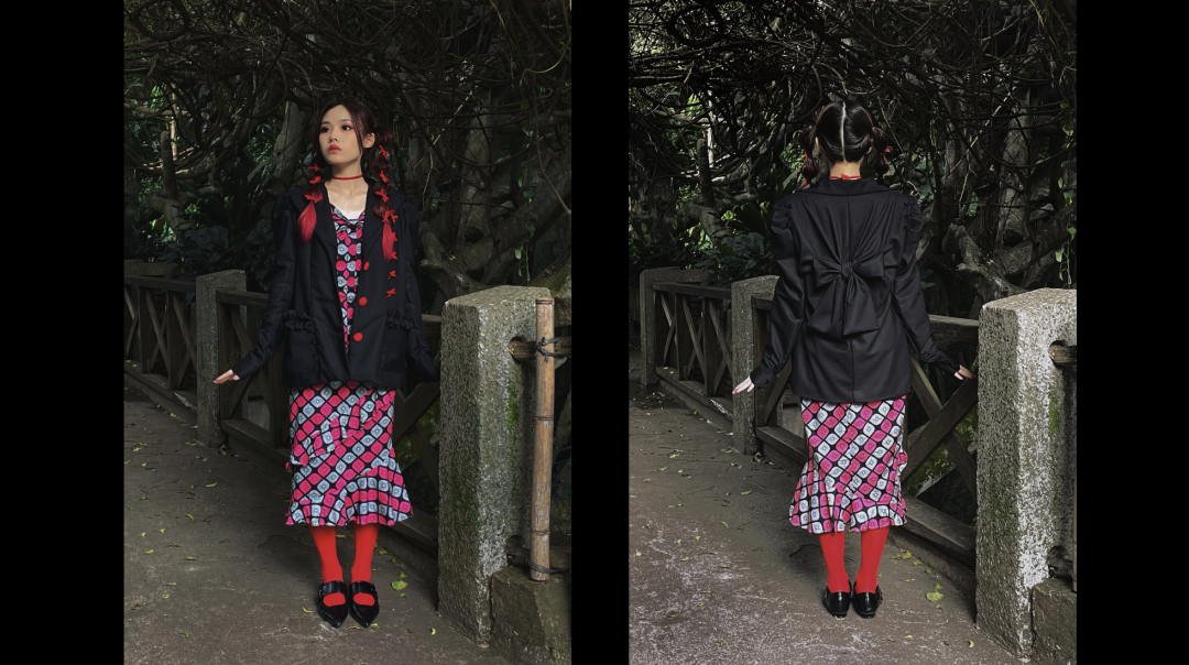 作品灵感来自电影《梦》,作品通过将人偶真人化,表达人偶下班后也有自己的想法,想穿的衣服,想去的地方。采用垂顺轻薄的哔叽面料,以丝绒蝴蝶结、红色纽扣和雪纺褶皱作点缀。服装后片加入蝴蝶结设计,打结的同时形成褶皱,体现拉扯感,也给人偶背着蝴蝶结行走的戏剧性。