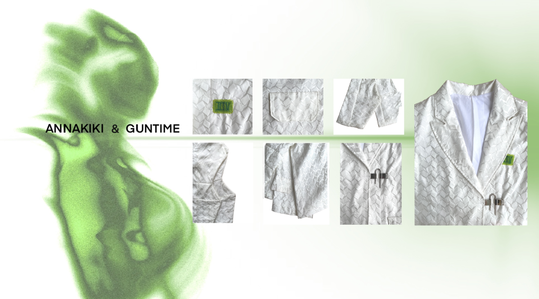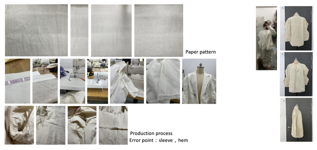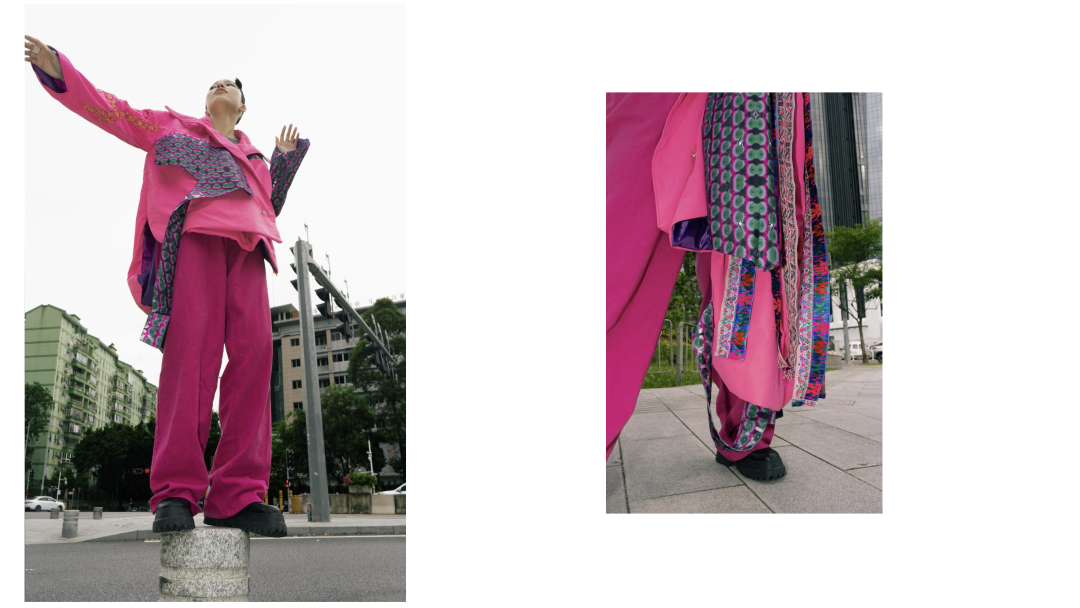 作者虚构了一个品牌ebb,并基于这个品牌进行设计。作者选择了深红色的条纹面料,扩宽与加长了袖子,灵感来自于藏传佛教的僧服,衣领没有烫折,为了让衣服更加类似僧服的垂感。视频前半段讲述了维族女孩在古着店选购到这件西服的故事,是人们回归线下的冀望与民族、文化的融合的体现,这同时也是ebb想传达的。视频的后半段与ebb进行了呼应是一种类商业化的尝试。