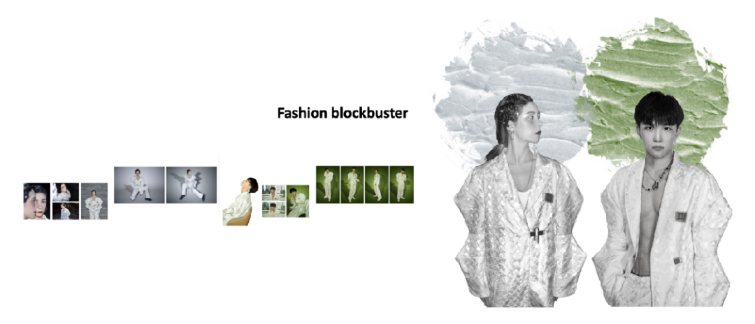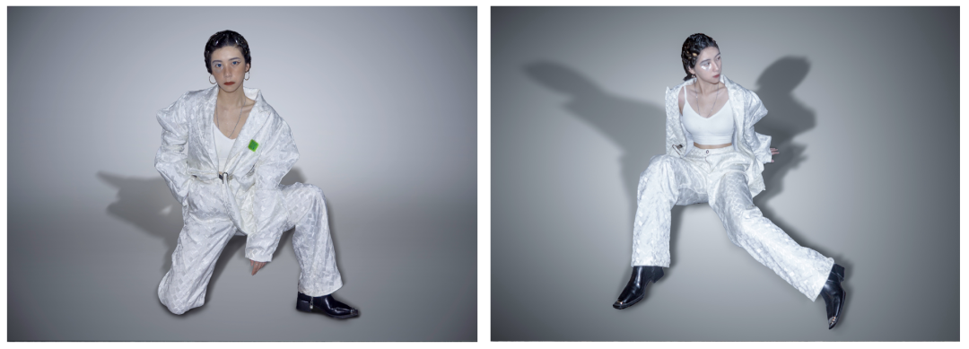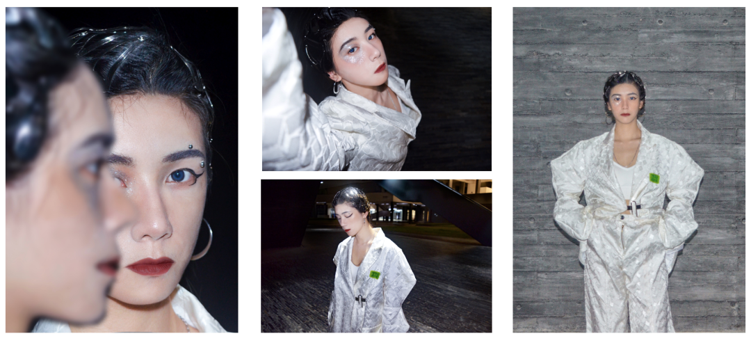 作品的主题是力量(power),提到这个概念第一个想到的对象是拳击手,所以从一些女拳击手的身体肌肉中提取了廓形。色彩选择了全白,因为觉得简单的配色相对来说可以更突出廓形,后续可以通过材料的不同质感分出层次。面料选用的是人造皮革,像拳击手套的材质,有韧性,也具有空间感。视频展示用的是比较街头的配乐,通过画面色彩的切换,形成一种力量和柔和的对比,这也符合我对女拳击手的印象。