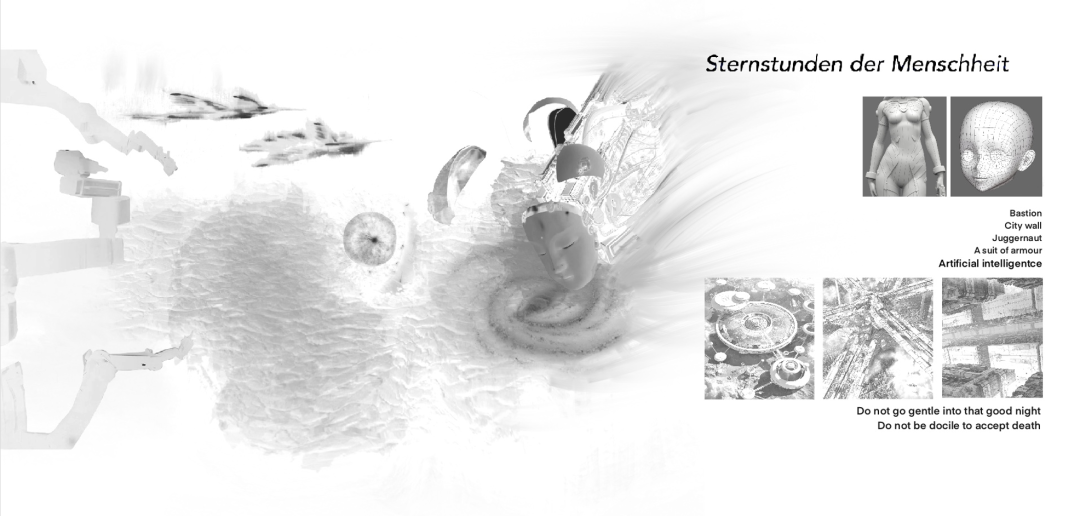 作品灵感来源于科幻电影《星际穿越》,影片中未来人类拯救当今人类的情节引发了作者的思考,作者从末日之时的死亡和生存展开话题,以末日机甲和人体结构为主要元素设计,表达“人类永远不会温顺地接受死亡”的思想。