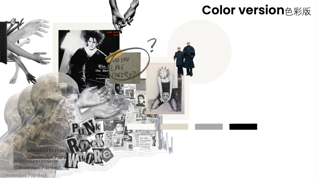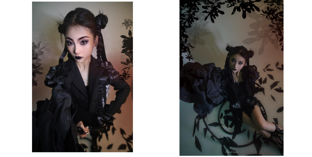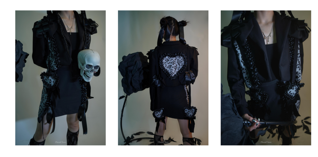 作品灵感来源于哥特美学电影《断头谷》,影片在关于光明与黑暗、善与恶之间的冲突,迷恋死亡的气息及离奇怪诞的表象之下,驻足于人类对自身的关注,将信仰与精神内涵隐喻其中。本次作品通过影片中引发的对生命死亡重生的思考联想到植物枯萎、腐烂、重生这一生态循环,结合风蚀的墓碑、幽暗的森林、似魔鬼手臂一般的树枝和缠绕在上面的藤蔓、远方的浓雾等元素,提炼成为本次成衣的主题。