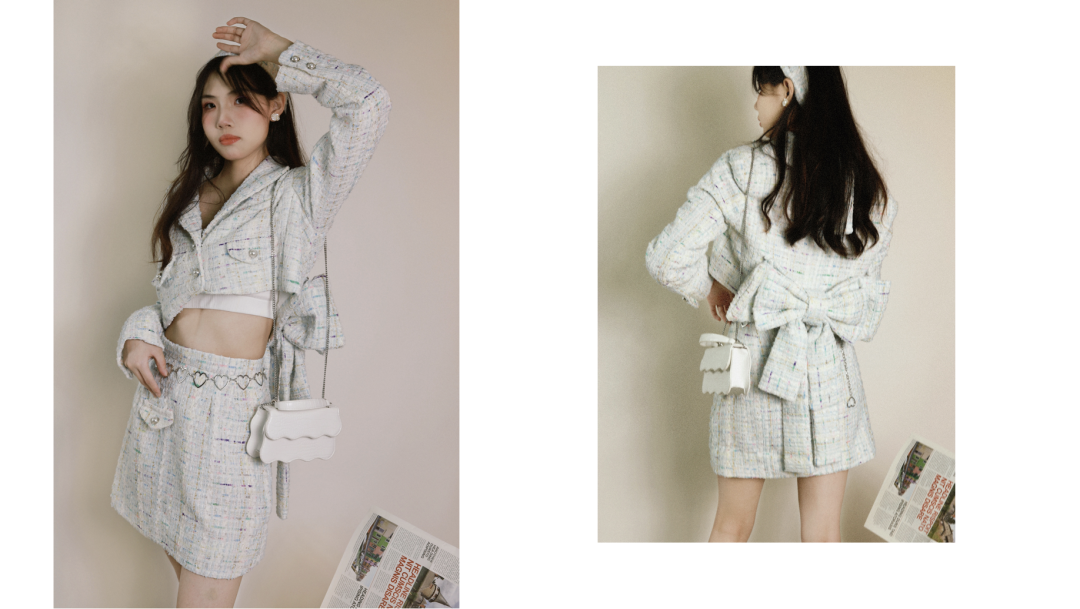 选用了诗词里的意境,进行联想,将古人的精神世界与我的想象结合,进行跨时空的对话。面料用了肌理面料,加入了蝴蝶结、盘扣等元素,廓形采用宽松H型,以及做了开叉设计。