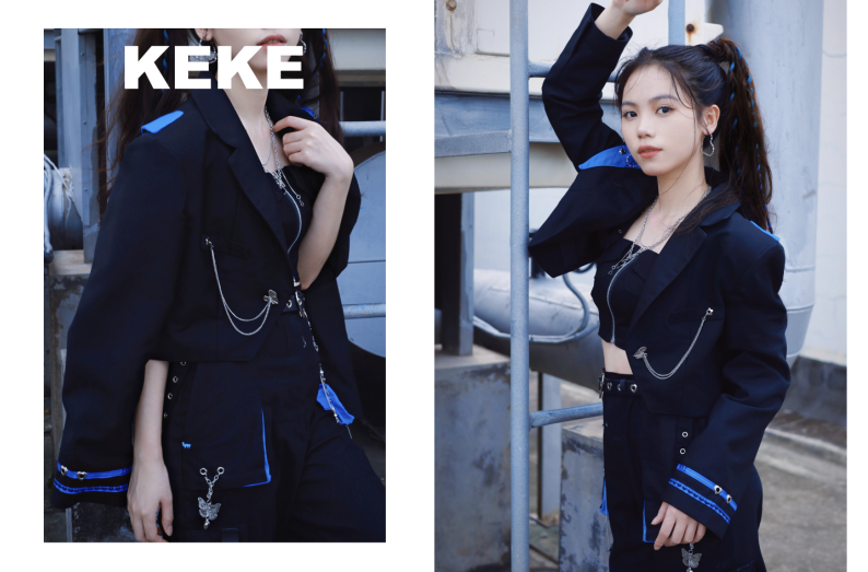 作品灵感来源于复古怀旧80、90年代的港风电影以及童年的回忆,渴望回到充满理想充满幻想的年代,渴望回到纯朴的年代。作品运用绑带设计的束缚感表达现实,视错觉体现幻想,镂空门襟打破传统西装的沉闷,门襟采用左右交错搭扣,现实与幻想结合,碎片式的记忆交织在一起,分不清现实与幻想。