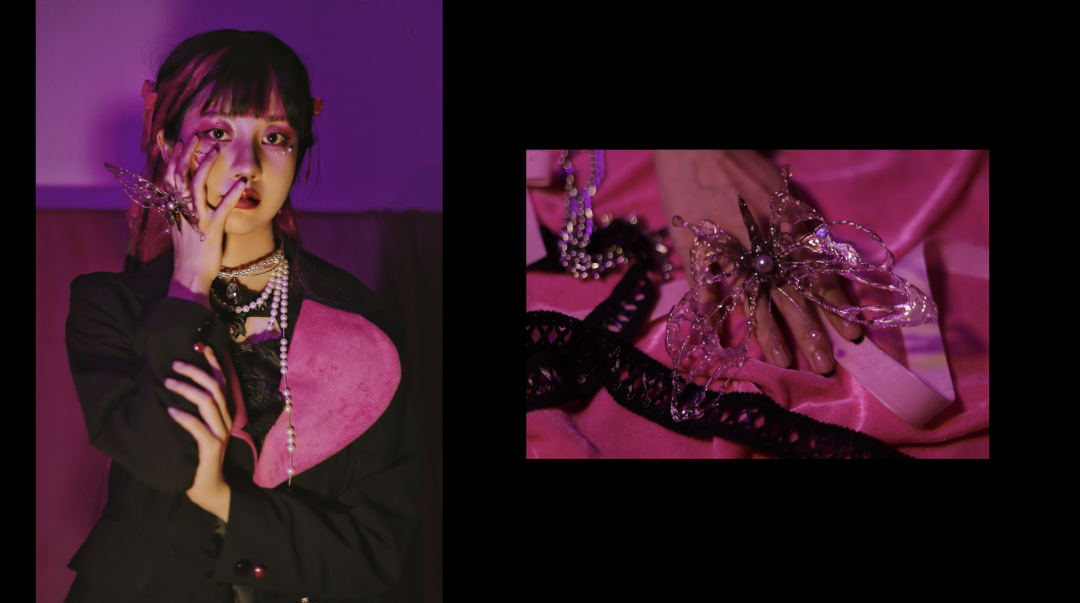 Gothic Pink是作者第一次对西装工艺制作的尝试。这次的设计沿用了一直以来非常喜欢的黑粉配色,也更多注重实穿性。模仿了Vivienne西装追求的经典复古版型,将翻领扩大变形和上片下摆分开掐出腰线。在作者的意识里女性是享受表达美的主体,为了漂亮的漂亮也并非没有意义。