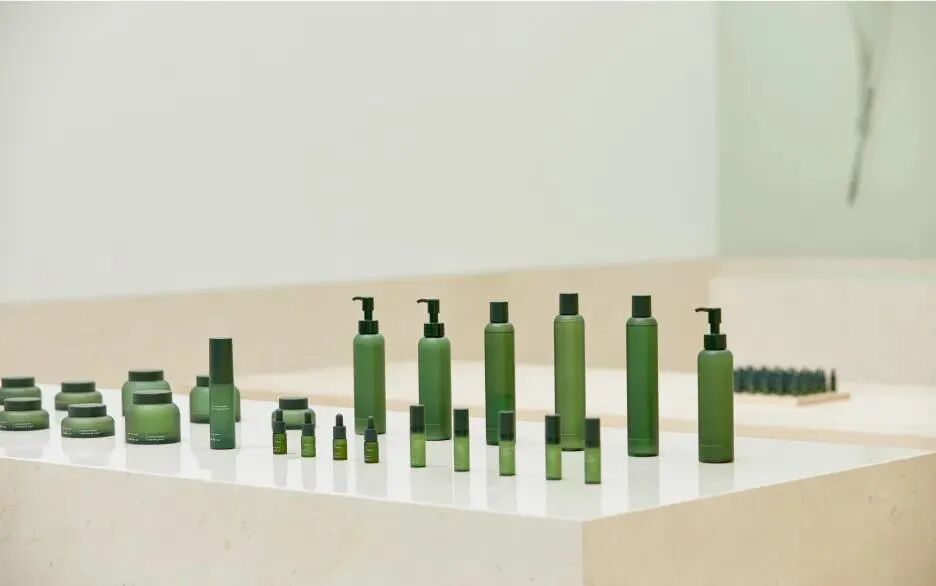呈半透明状的深绿色包装,代表着潜藏在大自然中的生命力,围绕细长高挑与敦厚凝重,这两种极端但同时又各富特色的造型拓展包装设计。