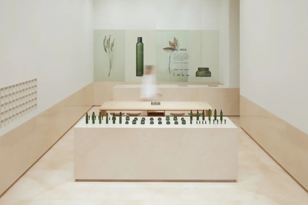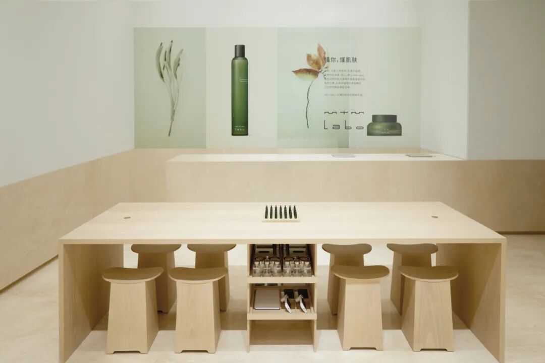 mtm labo门店色调围绕暖色系的白展开,同时对天然的石材和木材进行区分使用,由此打造出具有柔和质感的空间。