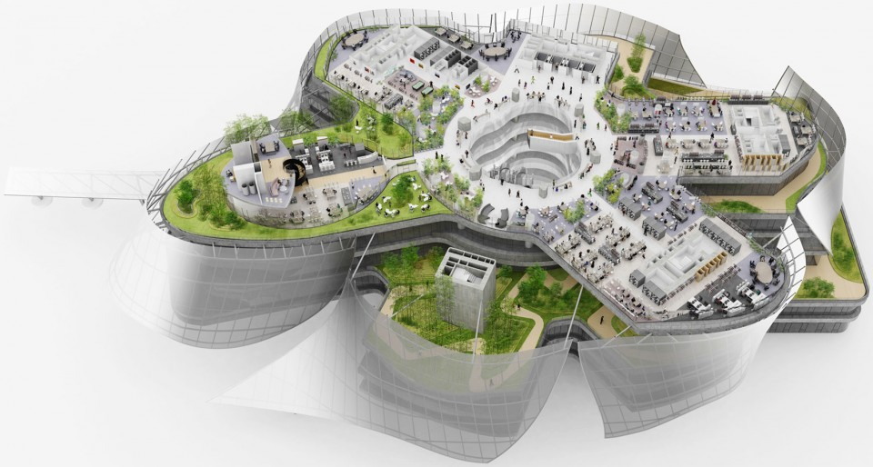 其建筑设计由MAD建筑事务所马岩松大师亲自操刀,以一个圆形中庭为轴心及六个核心筒作为“骨骼”,六个大跨度空间发散型星状布局,形成充满力量感的骨架结构,其间办公空间和绿色花园混合布置。