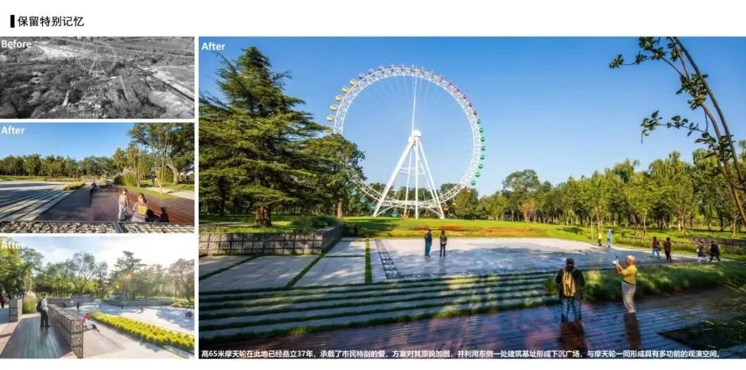 还留在场地内的摩天轮,市民们特别呼吁对其进行保留,方案对其进行原貌加固,并利用东侧一处建筑基址形成下沉广场,与摩天轮一同形成具有多功能的观演空间。