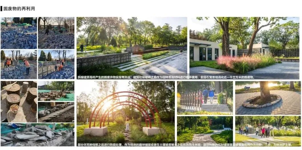 拆除建筑等所产生的废弃物实现零外运,破碎之后作为园林景观材料进行循环使用,同时场地内伐除的坏死树、拆除的石材铺装等材料等都进行了再利用,实现低碳环保的初衷。