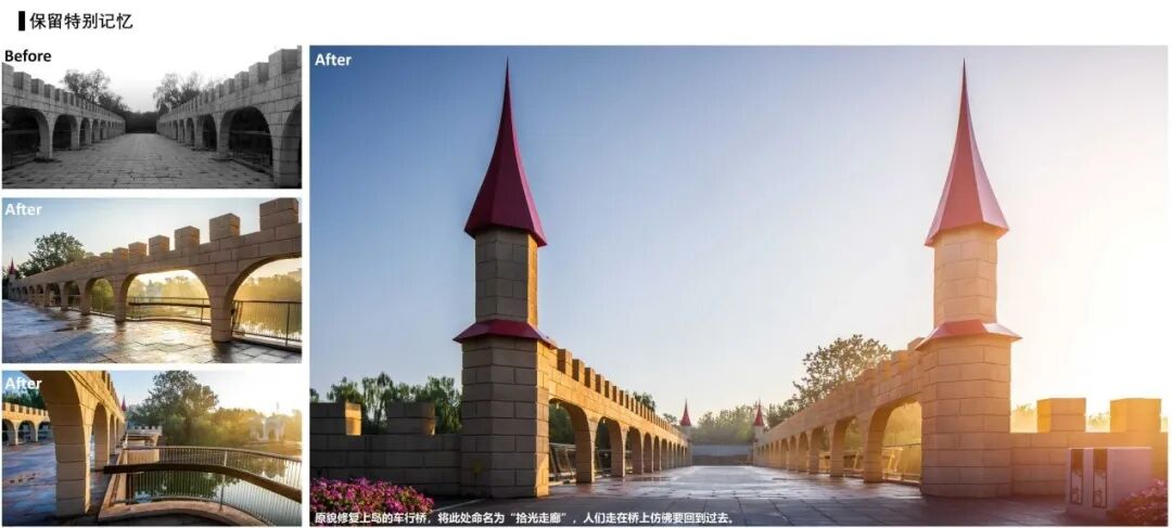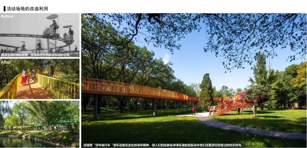 适合不同年龄的各类活动场地被巧妙的安置,如在原有建筑拆除后的基址上设立的健身活动场地、在“激流勇进”游乐设施拆除后的空地上布置的宿根花卉观赏园,在原“空中自行车”设施处设立的空中栈道等,节约投入的同时让人们感受到熟悉的空间尺度和氛围。