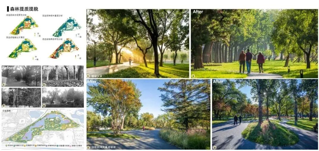 3)城市森林提质提貌:结合现有林地的各项生态指标,分类梳理现有林木,通过复层混交、异龄更新、丰富色彩、突出水岸等方法形成生态结构稳定,林貌丰富的城市森林。