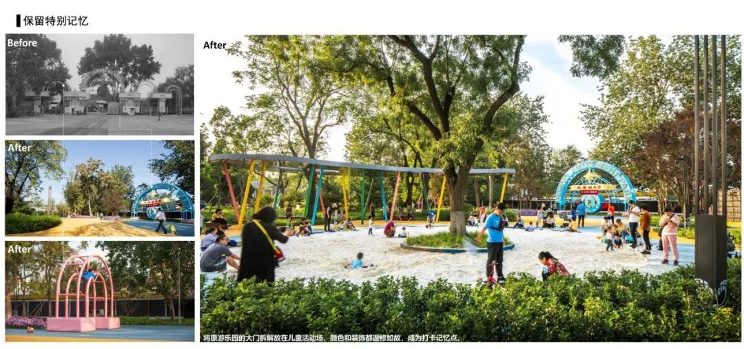 原游乐园的大门是市民特殊的记忆点,方案从以下两个方面保留场所精神:一是保留原入口的空间格局;二是拆解原大门,将其翻新放置在儿童活动区,成为打卡记忆点。