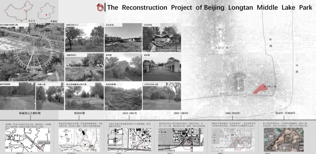 龙潭中湖公园位于北京首都功能核心区,占地39.8公顷,其中水域面积11.7公顷。元代时,龙潭湖地区只是大都城外的一片低洼地。明清时期为了修筑外城墙,此地成为取土烧砖的窑厂,遗留了大量的坑塘。民国年间,又成为城市污水的汇聚地,生态环境遭受了严重破坏。新中国成立后,政府对龙潭湖地区开展了大规模的整治,将常年积水的洼地、窑坑、苇塘连通形成东、中、西三个人工湖,著名建筑学家梁思成先生将其统一命名为龙潭湖。1985年,中湖被改建为北京游乐园,是北京最早的一处大型现代化游乐园,承载了几代人欢声笑语的集体回忆。2010年,游乐园合同到期,公园便一直处于闲置状态。2018年政府开展了近30万人次参与的民意征集工作,将其定性为城市综合公园。2020年作为北京市东城区重大民生工程开始实施,2021年,面向公众免费开放。