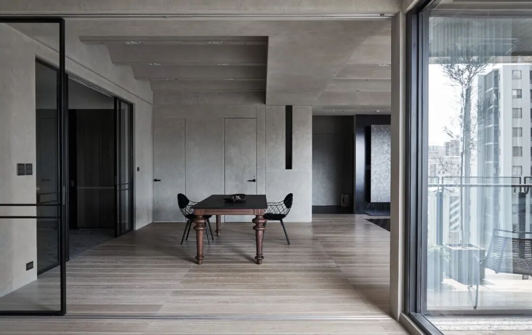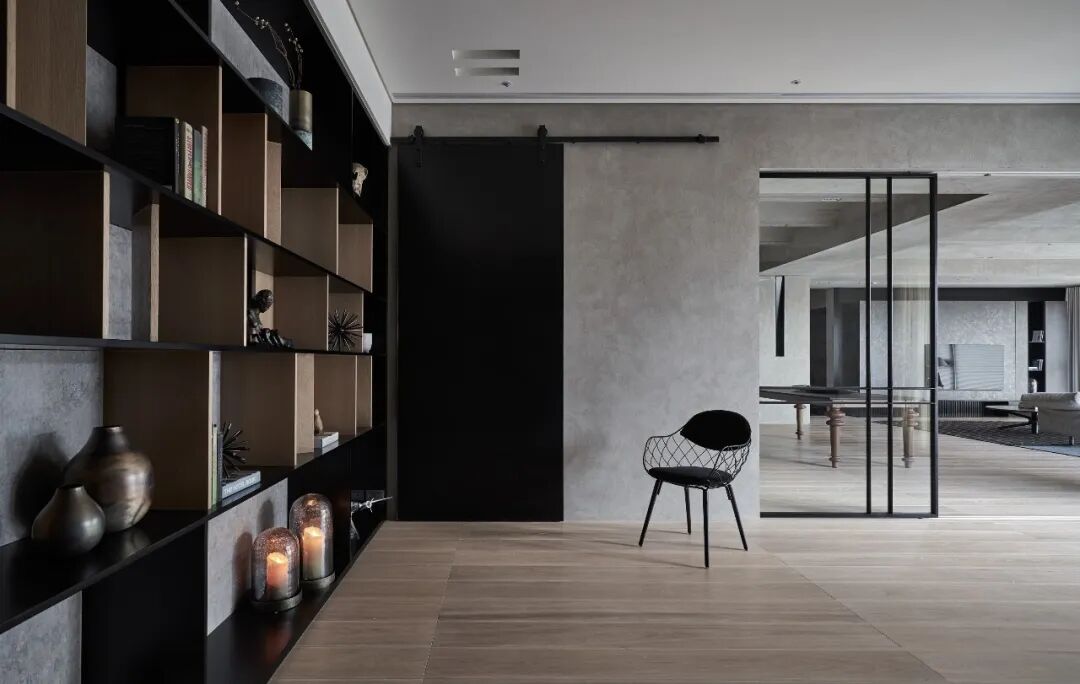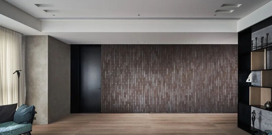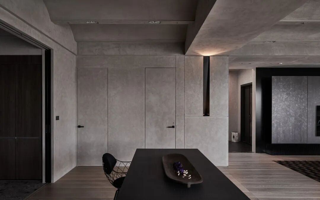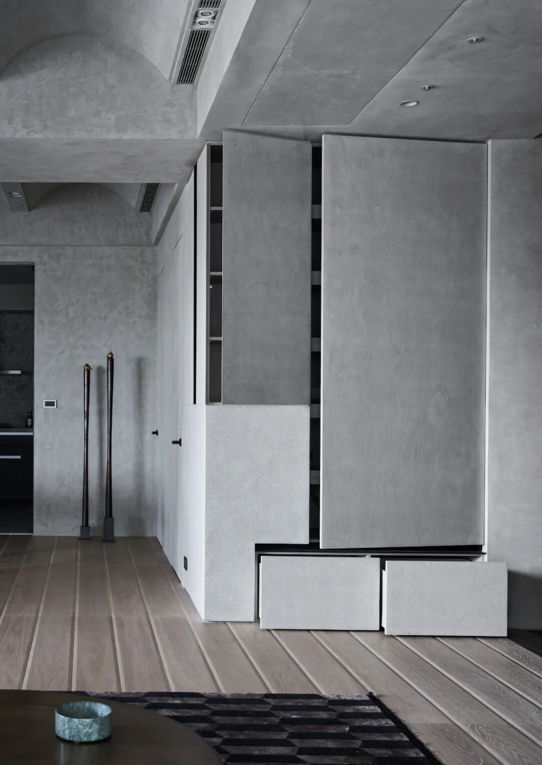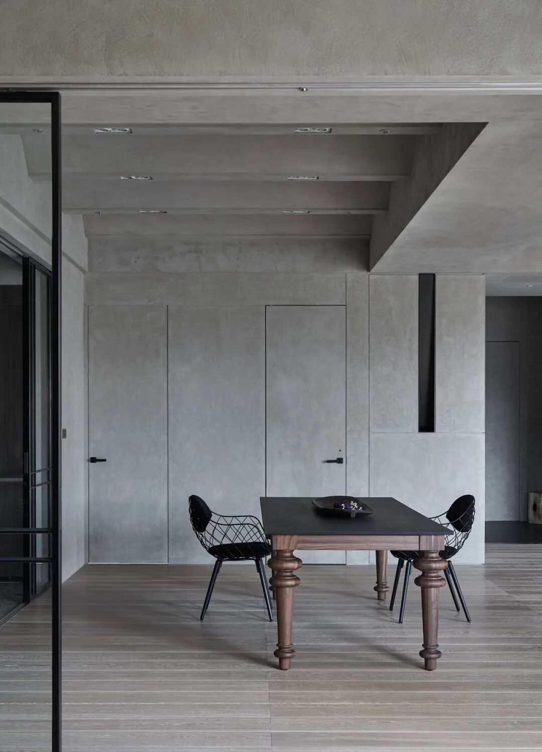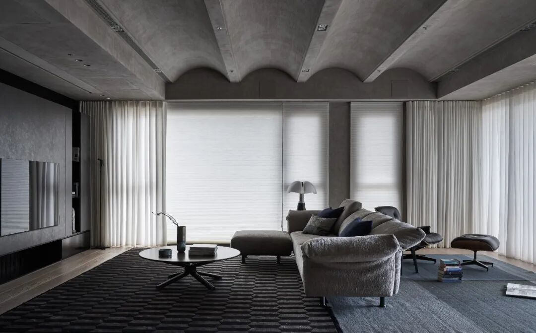 转过身来,我们可以看到一个天堂在我们面前:宽阔的客厅以灰色为基本色调,通过原始纹理揭示生活的真相;波浪形的拱门在天花板上荡漾;令人印象深刻的屏幕墙描绘了一幅水平的景观;黑色的窗框和墙壁创造了内外对话的场景。梦幻生活的节奏和情感转变得到了体现。