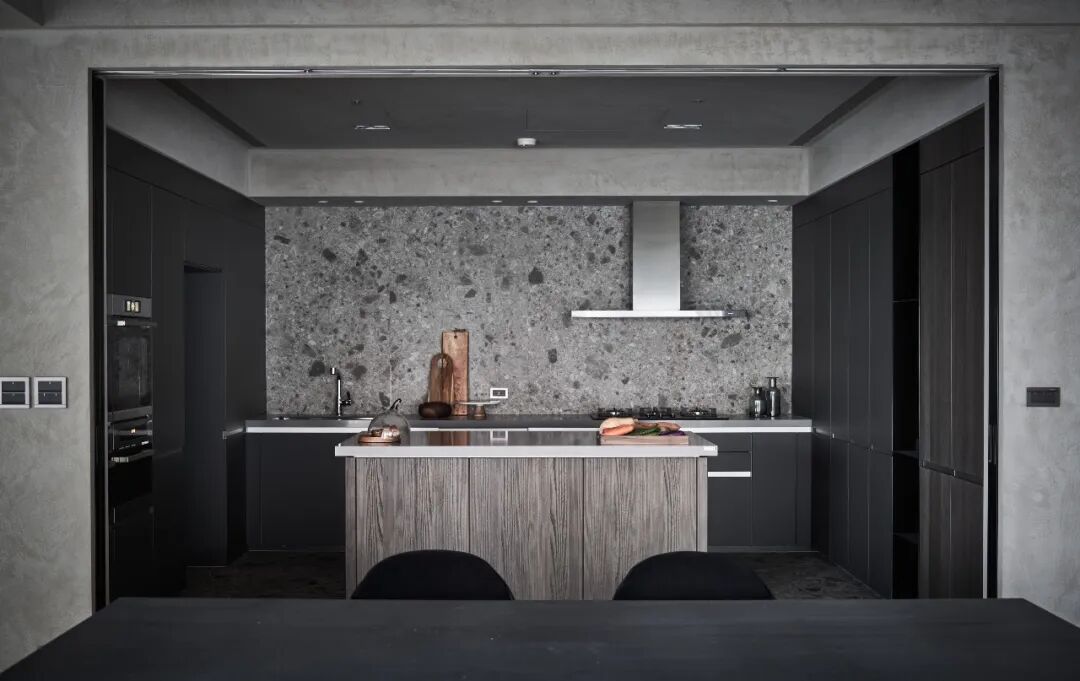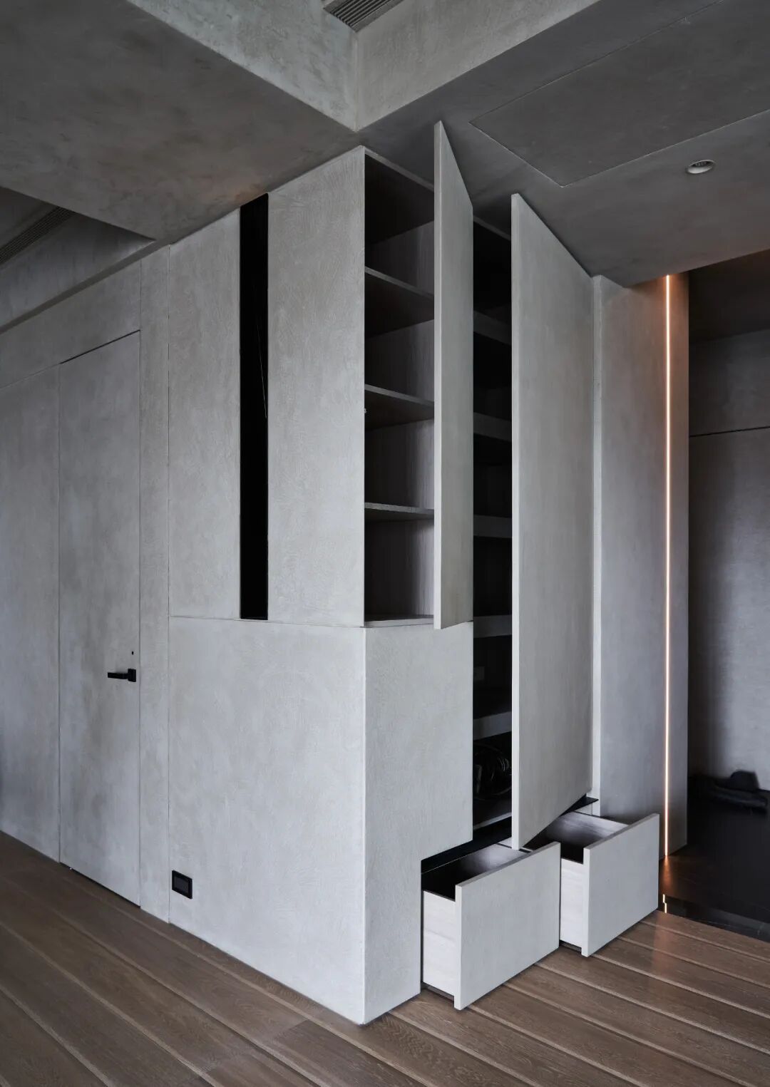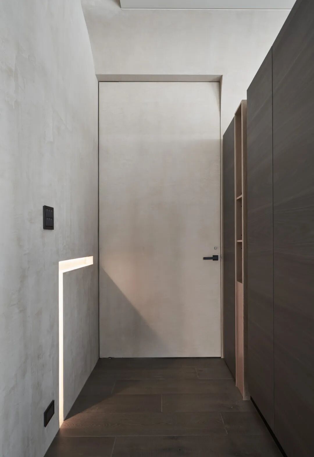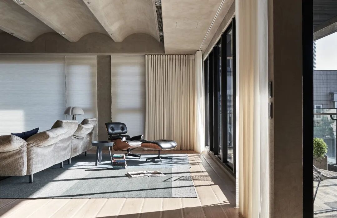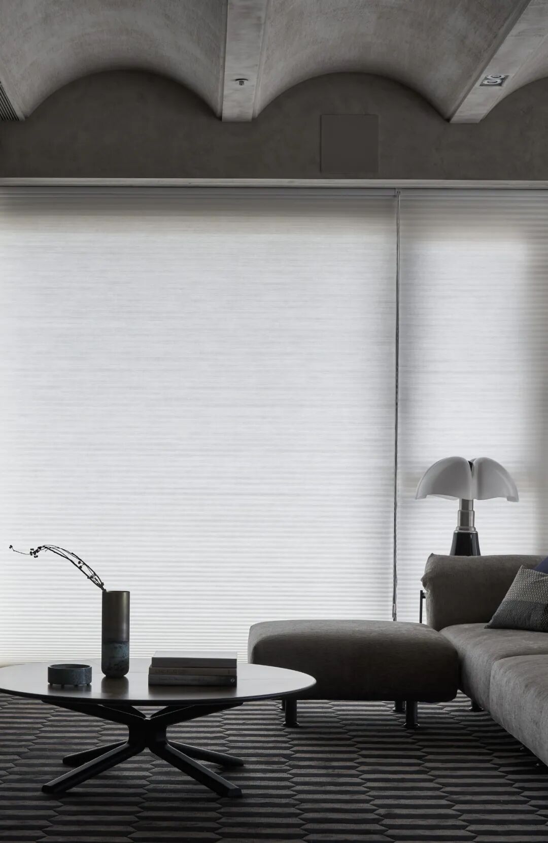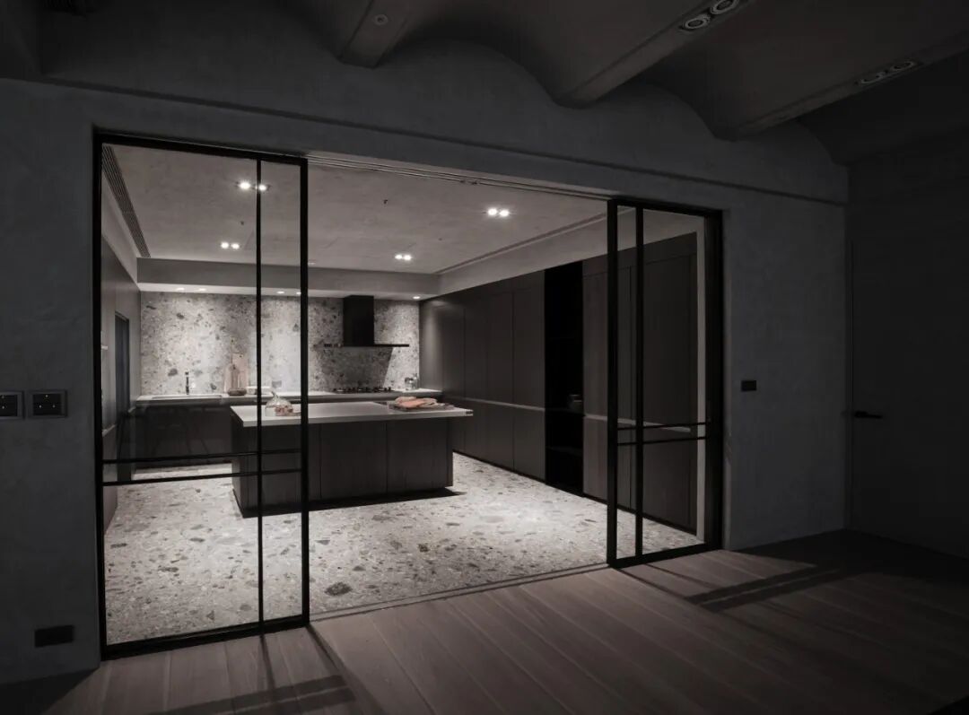转过身来,我们可以看到一个天堂在我们面前:宽阔的客厅以灰色为基本色调,通过原始纹理揭示生活的真相;波浪形的拱门在天花板上荡漾;令人印象深刻的屏幕墙描绘了一幅水平的景观;黑色的窗框和墙壁创造了内外对话的场景。梦幻生活的节奏和情感转变得到了体现。