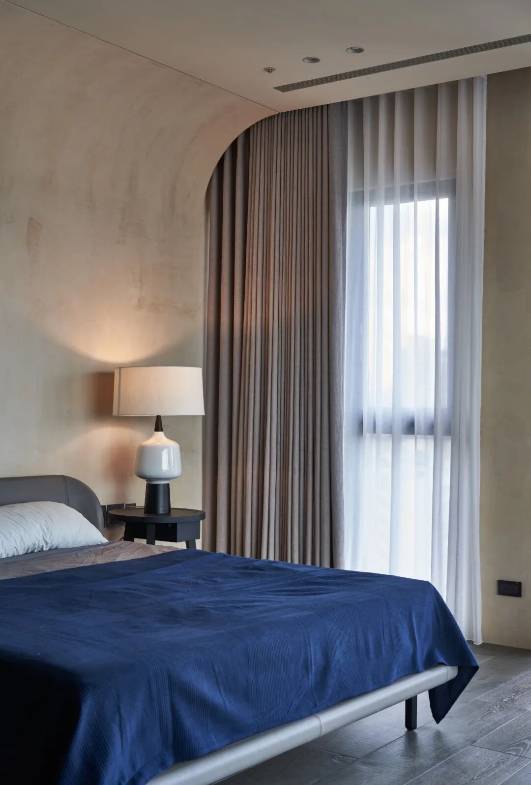 The main bedroom is covered by 2 gray wooden cases, which form a warm hole along with the arch falling down from the top. The light slowly infiltrate through the window and the walls, speaking of an eternity.