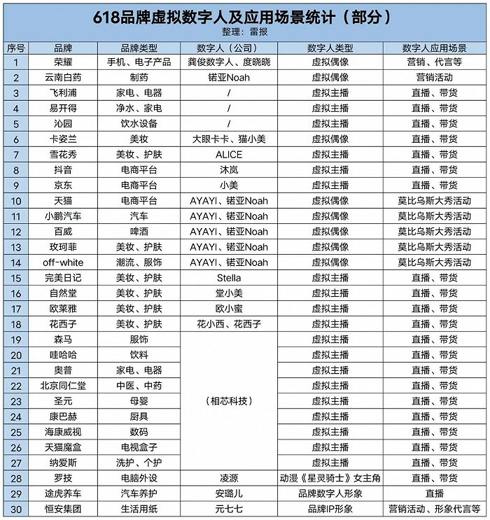 / 据统计,在今年的“ 6·18 购物节”中有超过 30 家品牌选择和使用了虚拟数字人进行活动营销 / 图源:链新