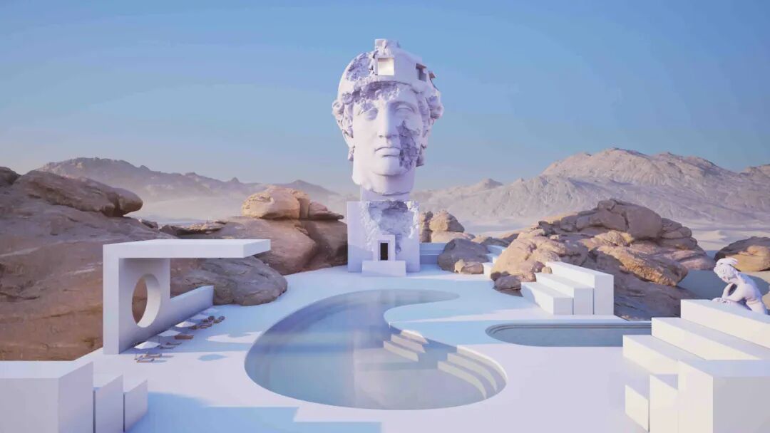 元宇宙社区 The Row 邀请了一批全球知名的艺术家推出了一系列虚拟建筑,包括由 Daniel Arsham 设计的一座巨大的雕像组成的房子,以及一座全天不同时间点会变色的房子。