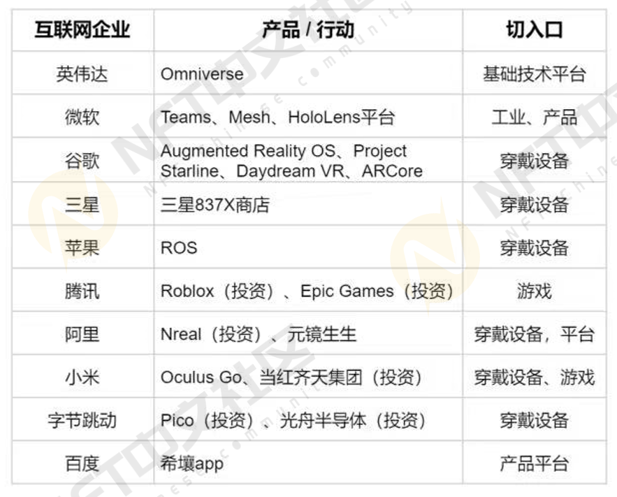 各大互联网头部企业如何抓住这一契机,又如何紧跟时代进程发展,考验它们的智慧。我们通过梳理观察全球各大头部互联网企业在元宇宙的布局和行动,试图分析行动背后的逻辑和思考。通过梳理下列表格可以看出不同的企业在面对新兴的元宇宙潮流面前,作出了不同的选择。