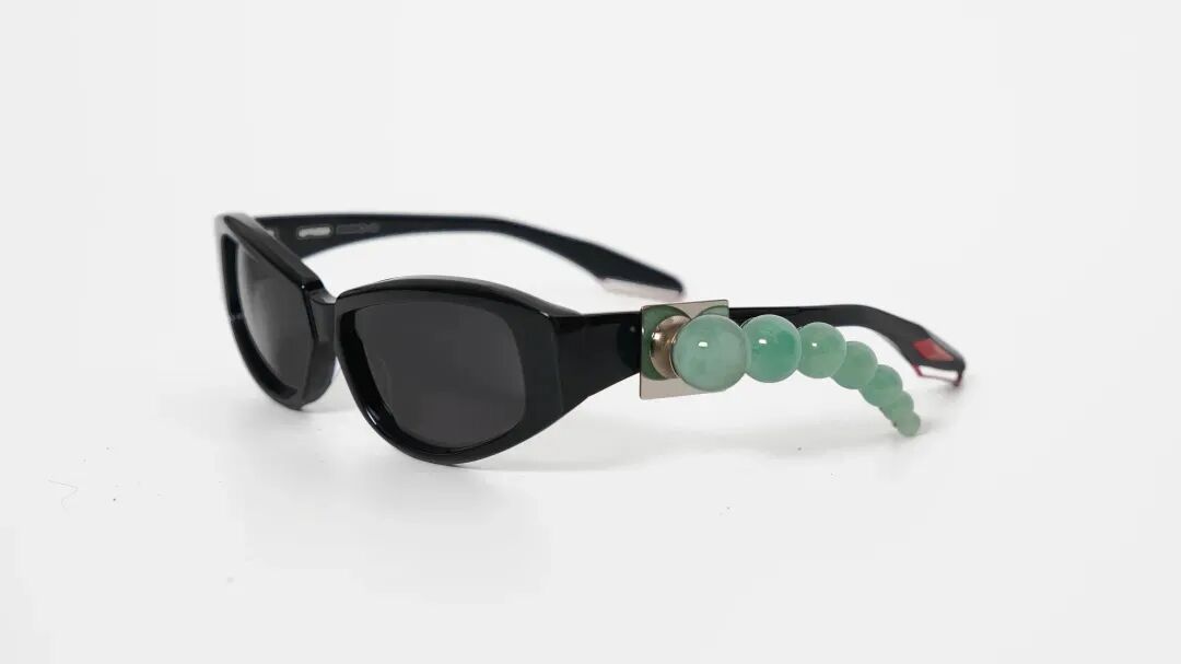 眼镜品牌SOFT PEOPLE AREA将玉珠串链成镜腿弧形,既可成为眼镜装饰的一部分,又能单独成为一款项链,打造模块化配饰概念。