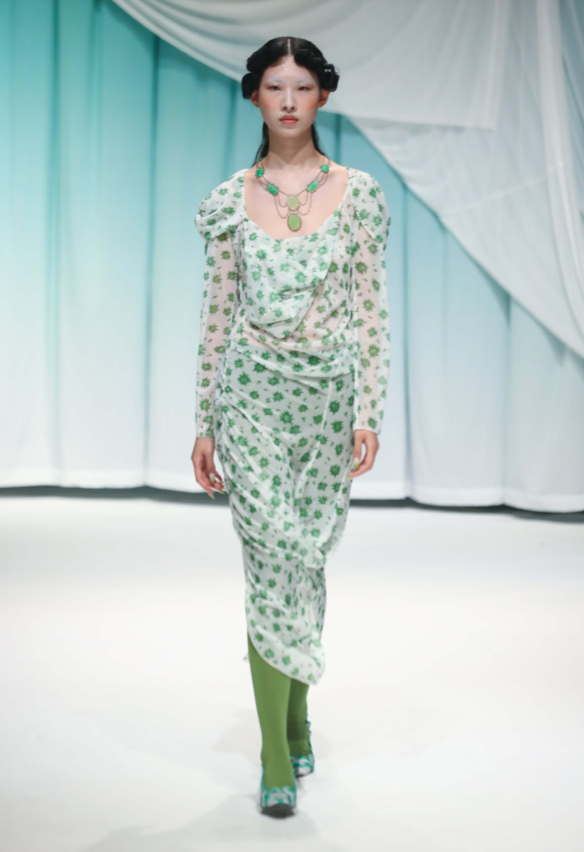 同样融合东西方文化的设计师品牌Yuhan Wang,更多了份梦幻唯美。2020SS中以《游园惊梦》为主题,玉石耳饰轻盈透亮仿佛散落的花瓣树枝,2021SS以《聊斋志异》为灵感,树脂仿玉石色质,西方维多利亚式浮雕与中式玉佩造型结合,珍珠串联,展现“怪异、柔软、细腻和感性的美”。