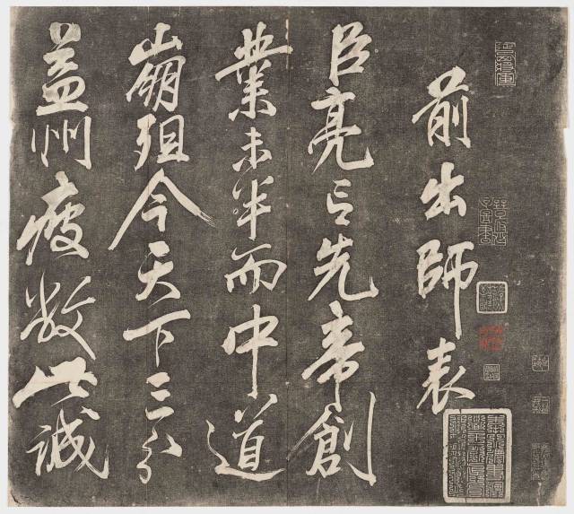 最初不到一百字,似行楷,稳重健樸,因为情绪力度还未凝聚。待力度储足,一步步推进,不觉何时变为行草,有大草,有小草。初时隐约如闻山雨欲來,雨落从远而近,由微至豪,自缓到急,直至万钧之力蓄势待发,一瞬之间倾排下來,到〔前表〕尾才稍作收拾。