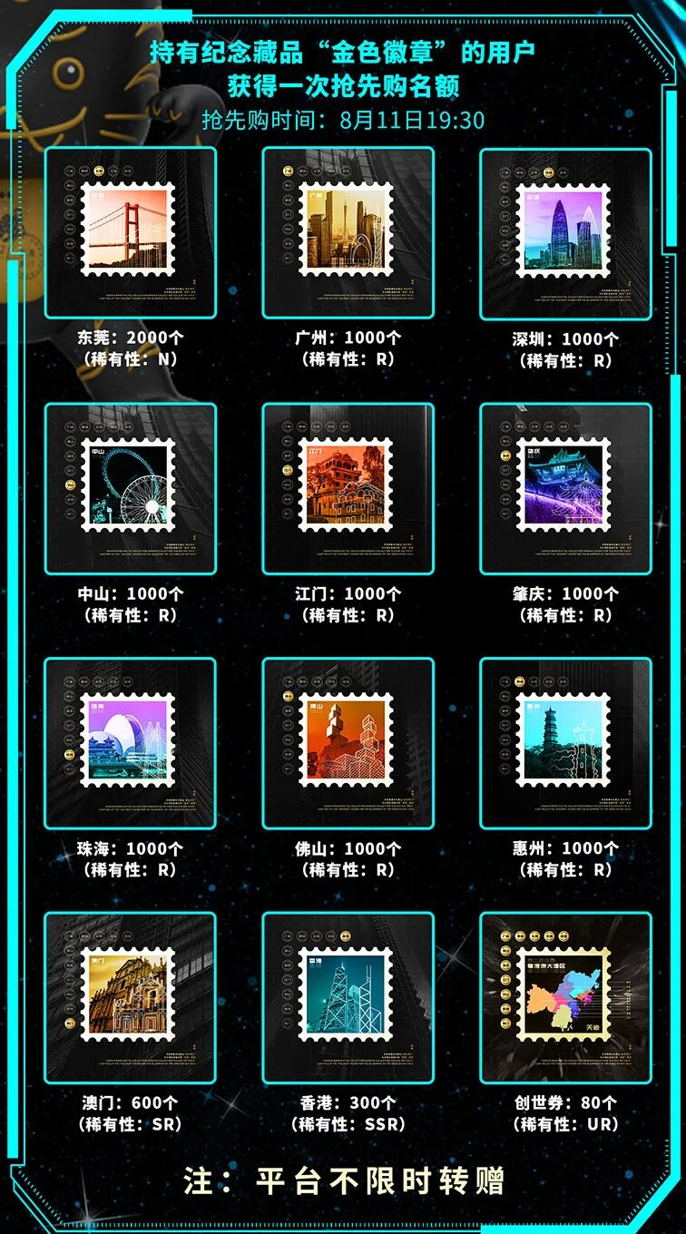 平台将于8月11日20时正式开启第一期“大湾区城市盲盒系列”抢购活动。