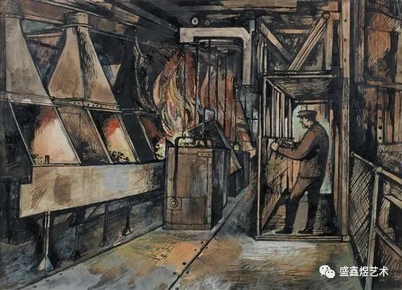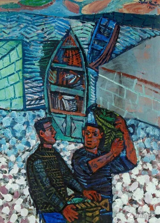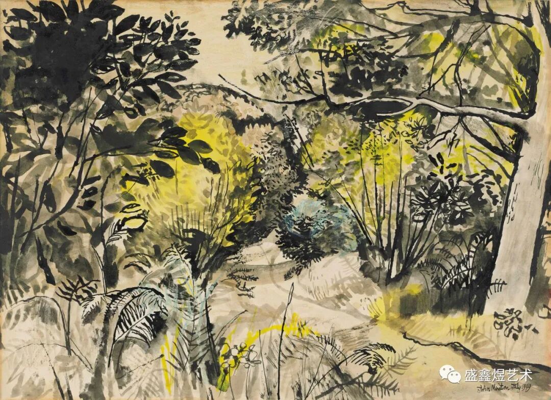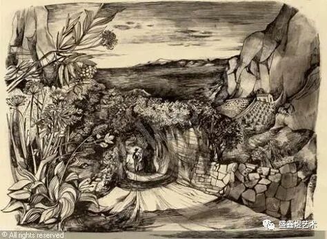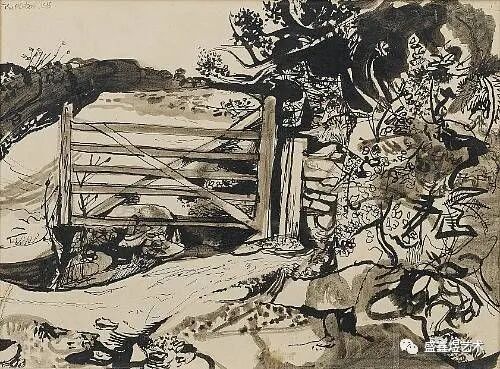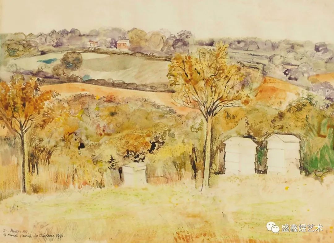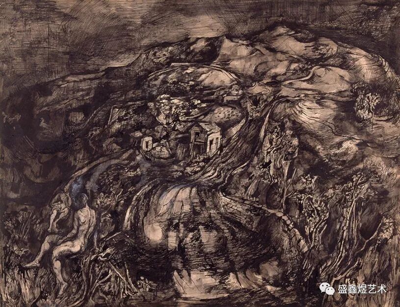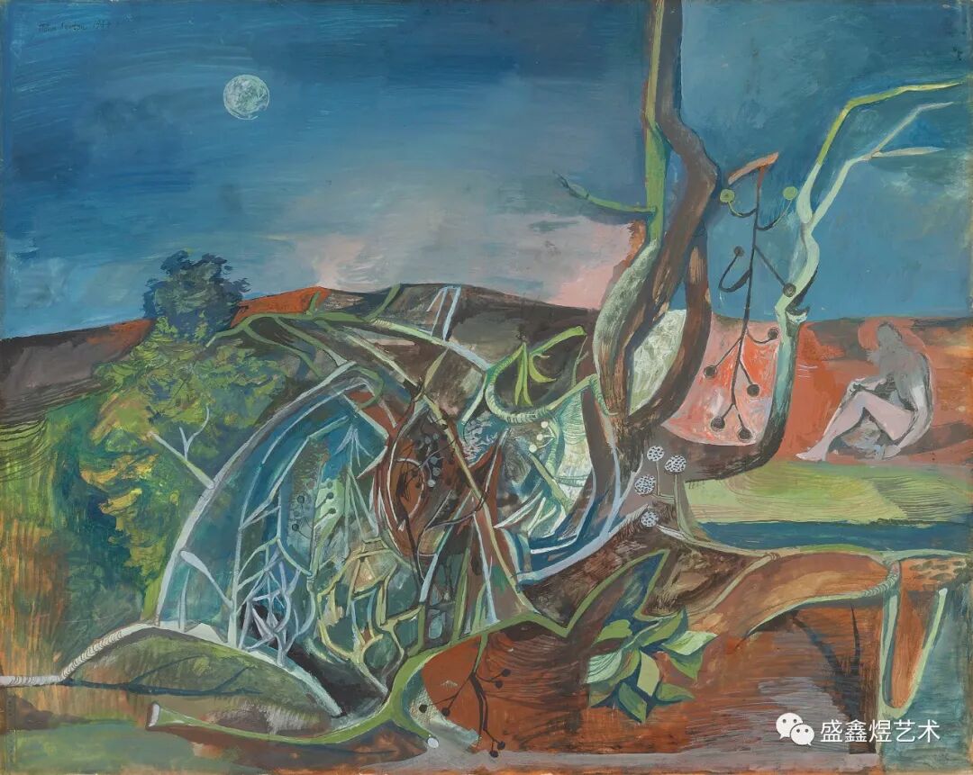 战争期间,他受欧洲“新浪漫主义”作品中柔美人物的影响,创作了受炸弹破坏环境中的年轻人的水墨画。后来,受 19 世纪富有远见的艺术家威廉·布莱克和塞缪尔·帕尔默作品中对收割者的田园描写的启发,他创作了关于在收割的月光下睡在干草堆中的年轻人的挽歌描写。