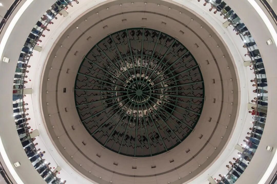 在互联网时代之前,香港商场建筑的类型学始于 1970 年代,将中庭作为商场身心的焦点,提供寻路的目的。随着商场规模的扩大,大容量、水平堆叠的中庭在香港很常见。从中庭可以看到不同层次的商店,商店向顾客展示数据,因为顾客可以看到商店展示的产品和风格,商店展示自己的信息,通过玻璃窗展示他们的最新产品吸引游客的注意力,希望他们能成为顾客。商场中商店的位置至关重要,商店通常更受欢迎,并且在商场内的游客可以轻松访问和看到时支付高额租金。购物中心中庭的空间就像一个数据全景敞视(Digital Panopticon)。