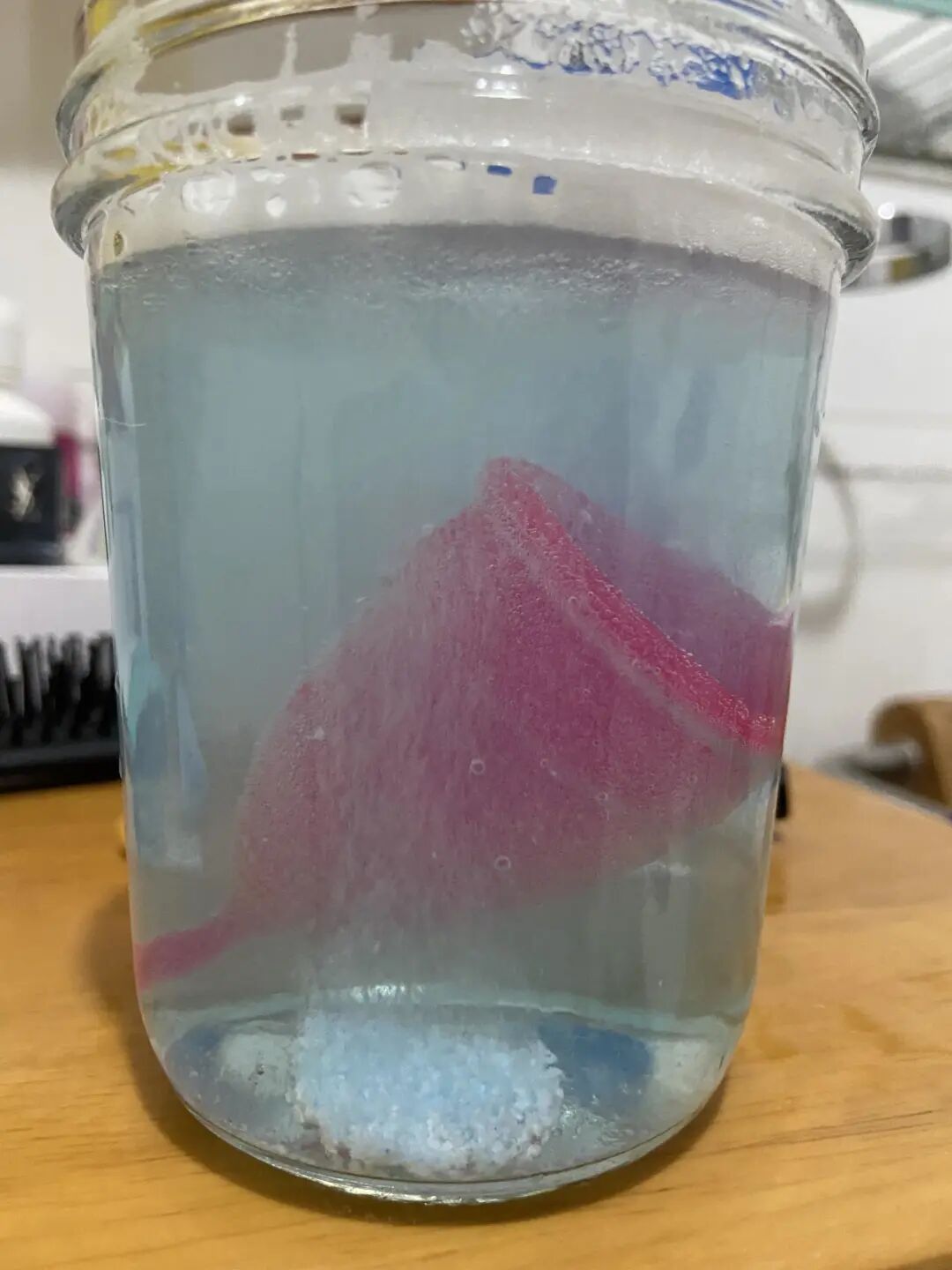 每个月再次使用前,给月经杯消毒也是一件好玩的事情。一般的建议是放在沸水中煮一会儿,或者装进杯子里放入微波炉叮五分钟。这个月我又(从“海马星球”的一期播客中)学了一个新的方法,就是用假牙的泡腾片给它浸泡消毒。