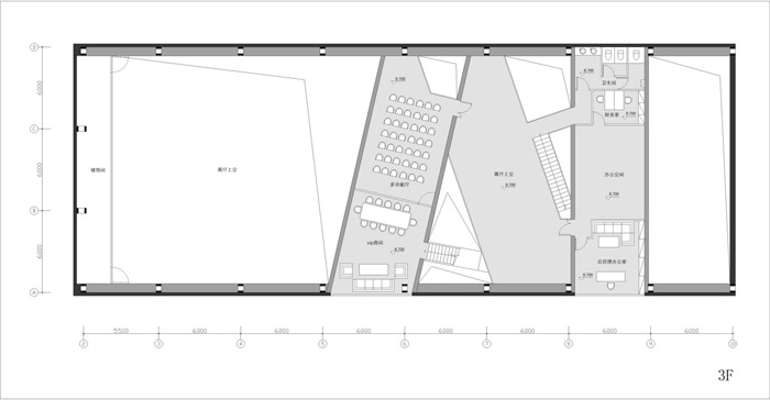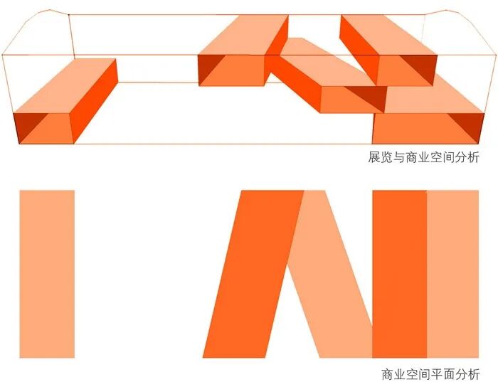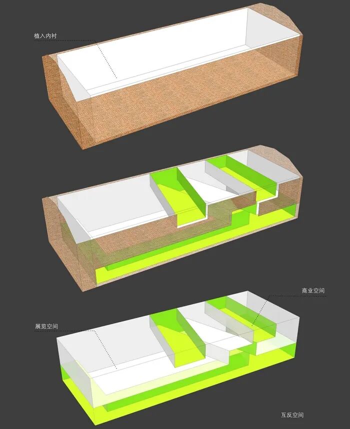 在这个12M高的厂房空间里,为了展览空间的最大化,商业服务空间被插入了展览空间的空中,并将商业空间体反应到外墙的窗洞上,筒状的商业空间体透过与其相对应的外墙窗洞与室外空间形成的贯通的整体。自由插入的商业空间与展览空间形成了互反空间,对于展览空间而言,商业空间成了它的外部空间,而对于插入展览空间的商业空间而言,展览空间也成为了它的外部空间。