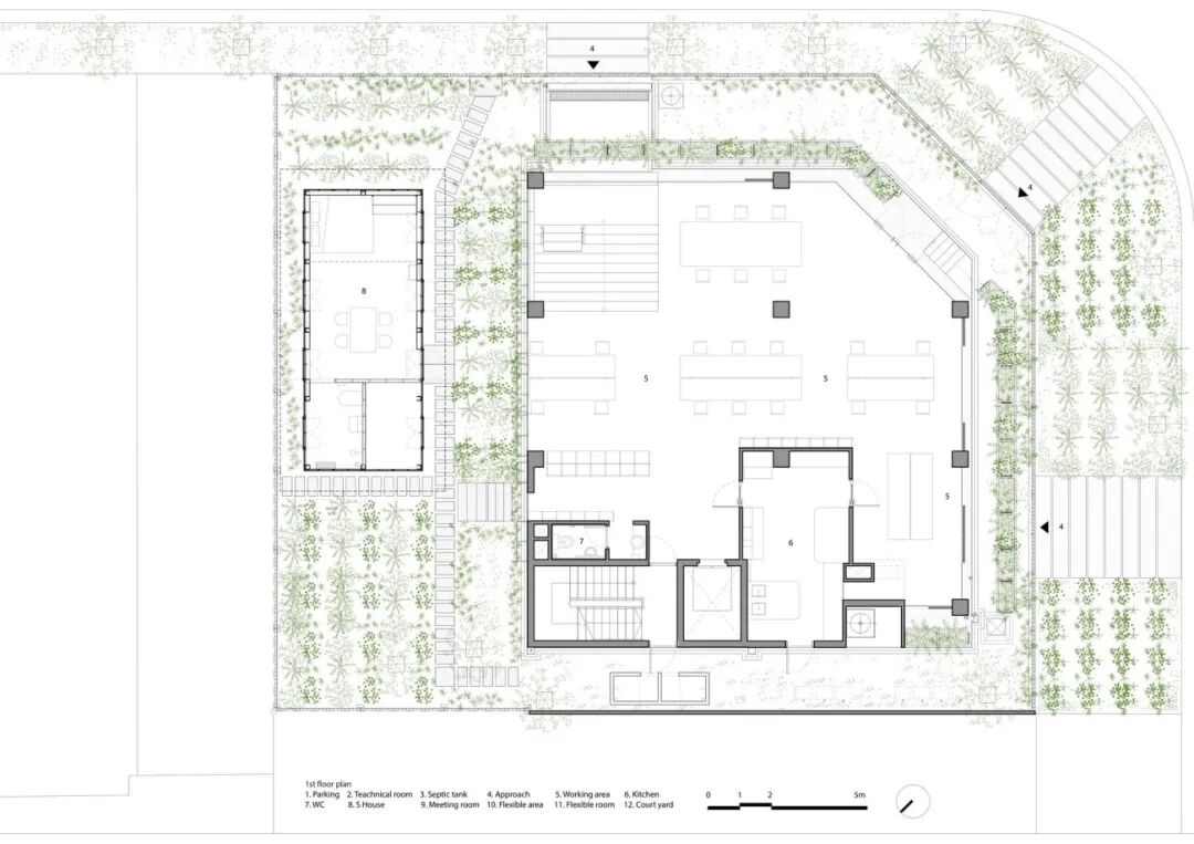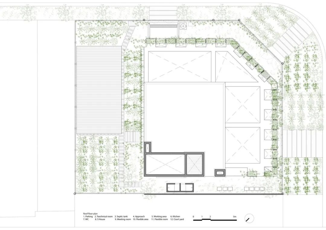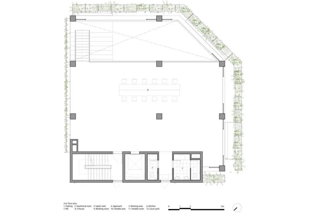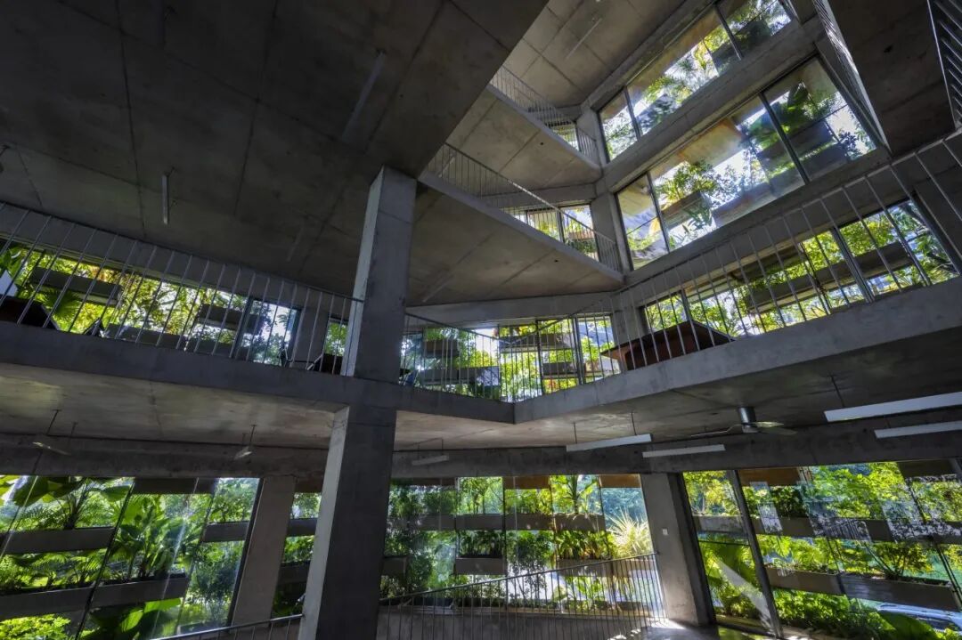 “垂直农场”在整个建筑中创造了舒适的小气候。结合玻璃窗,植被过滤阳光的直射,净化空气。它是用储存的雨水灌溉,同时蒸发冷却空气。相反,北墙相对坚固,便于将来的扩展,有小开口以加强交叉通风。采用双层砖墙,内部有空气层,以获得更好的隔热性能。所有这些都有助于减少空调的使用。