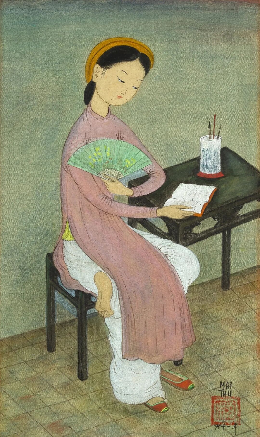 《手拿扇子的少女坐在书桌前》