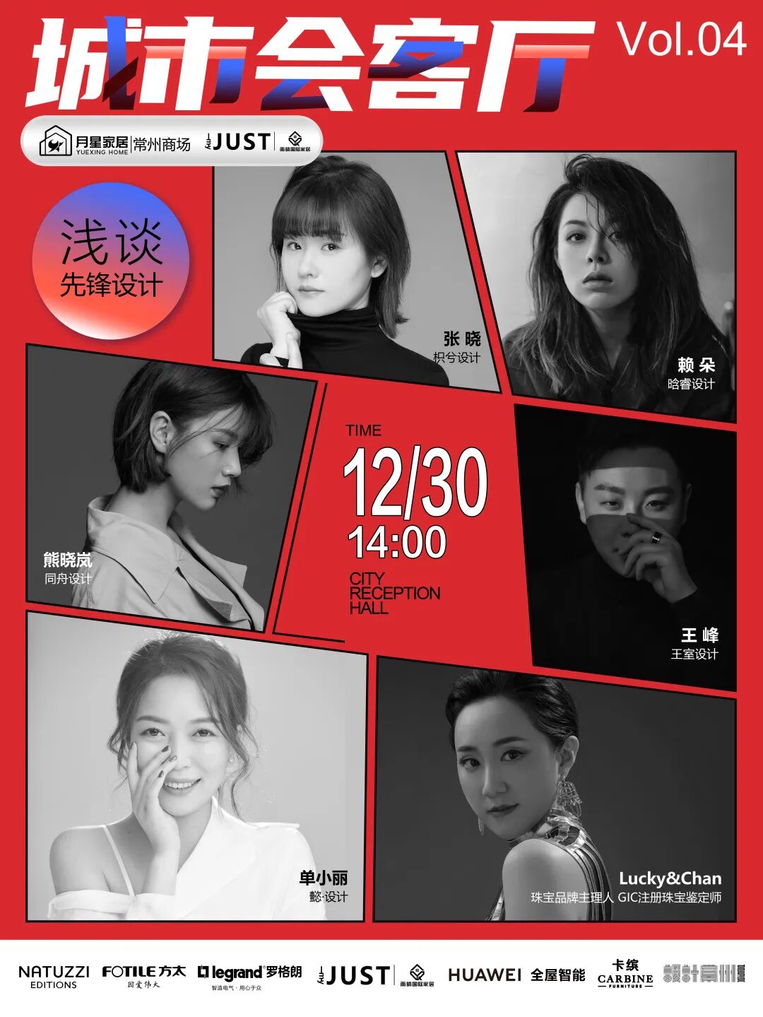 潮流之上,生活之中。12月30日,月星家居「城市会客厅」第四期,枳兮设计 张晓、晗睿设计 赖朵、同舟设计 熊晓岚、王室设计 王峰、懿·设计 单小丽五位设计师,与异业嘉宾 珠宝品牌主理人 GIC注册珠宝鉴定师 Lucky&Chan 共聚月星家居1F加时题展厅,与雨晴国际家居主理人 徐兴艳女士、设计常州Design 主理人 曹扬女士 一起浅谈先锋设计与时尚家居。
