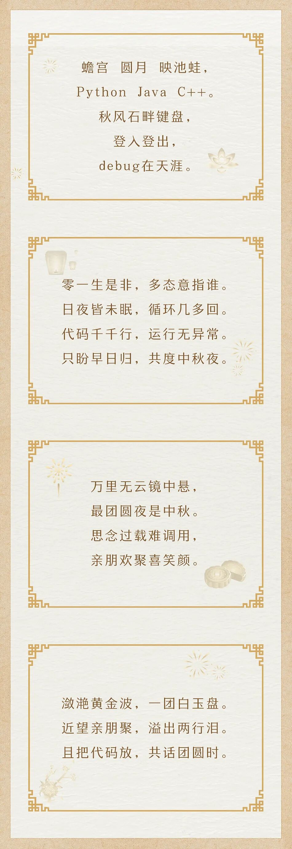 作为技术人的你,今天是阖家团聚,还是仍在他乡?我们准备了几首创意的技术范儿中秋诗,快来看看哪首最能描绘你的心情吧~