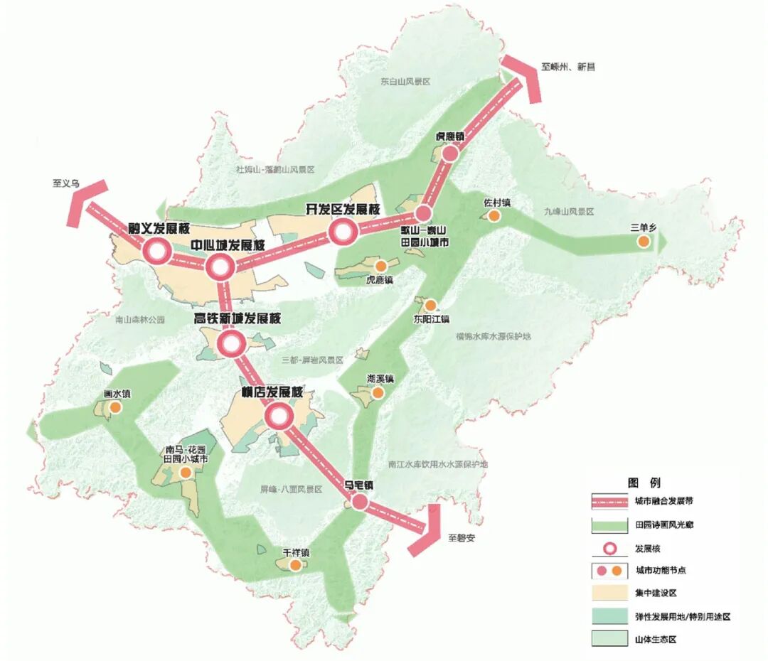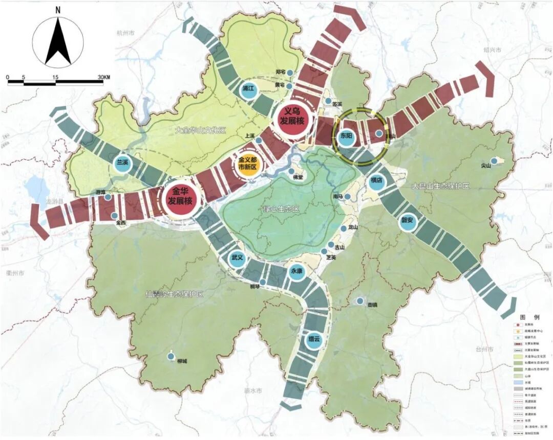在区域协同发展的背景下,东阳应依托自身日渐成熟的交通路网骨架,积极融入以金义都市区为主的区域经济网络,争取更大平台的发展机遇,建设都市区一体化发展新支点。发挥工业制造、历史名城、休闲旅游等优势,为东阳与义乌同城发展、优势互补,合力打造都市区经济带来历史性机遇。