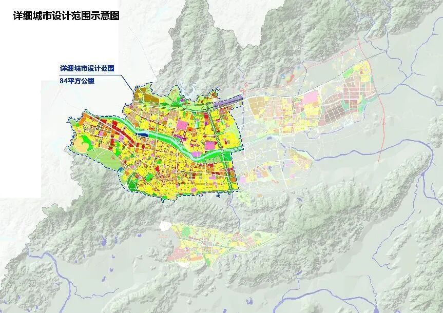 2)中心城区详细城市设计范围:中心城区范围为东义交界至甬金铁路站前路、南山至北山(含上卢区块、市民中心区块),面积约84平方公里。