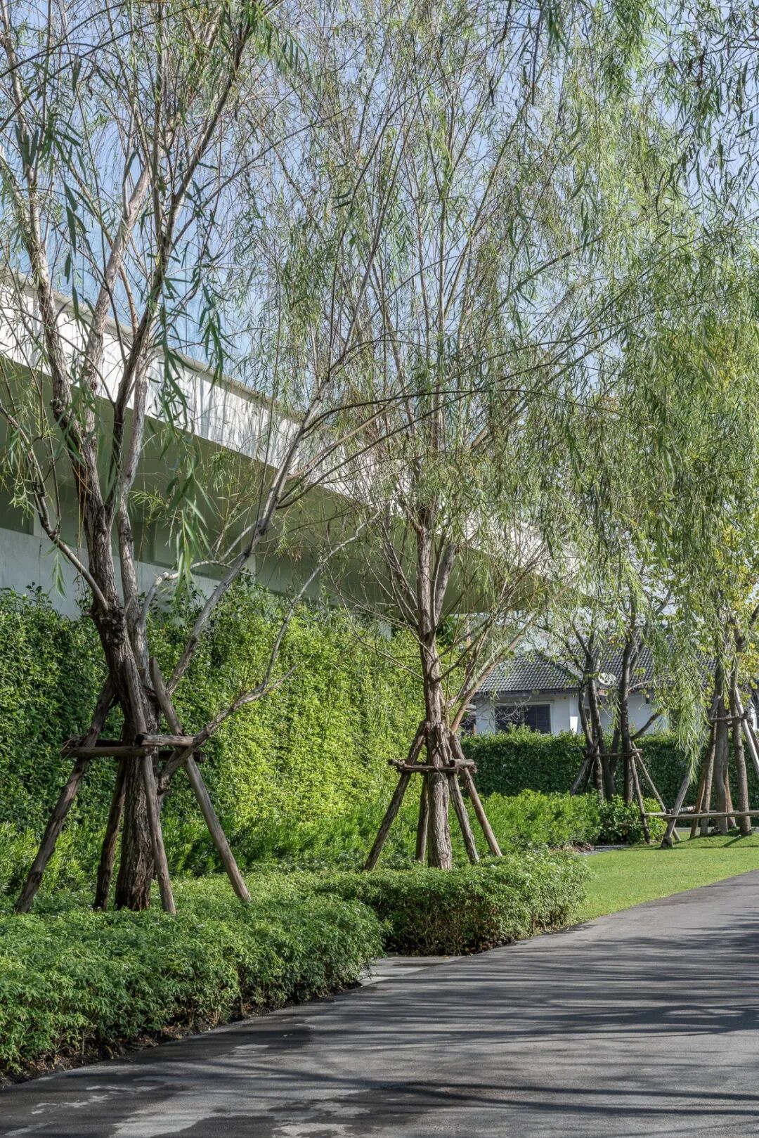 设计师们建议在地形上种植一丛柳树,将河边的休息室与主楼隔开,并在花园内形成一条蜿蜒的步行道。