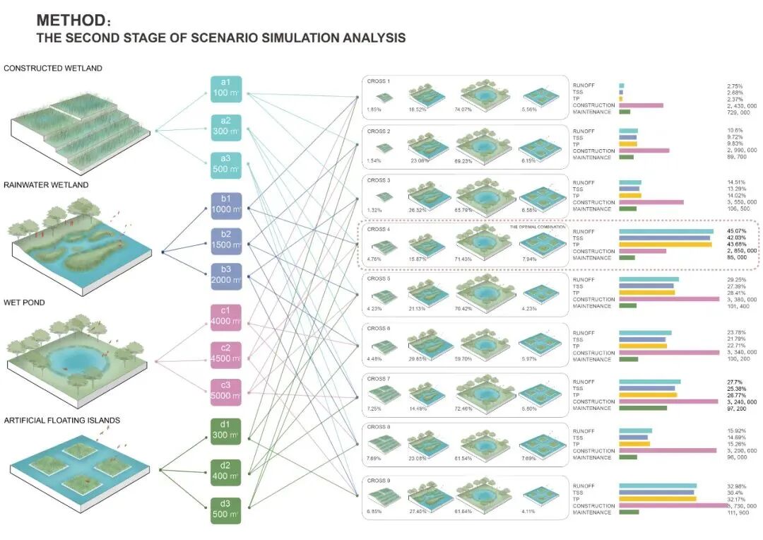 ▲研究过程:根据正交试验法则,将四个低影响开发设施作为组合因子,模拟出9种组合方式,在SWMM平台中分别模拟径流控制率,TSS和TP的去除率,并叠加建造及维护成本的计算,最终确定低成本高效能的最优组合方式。